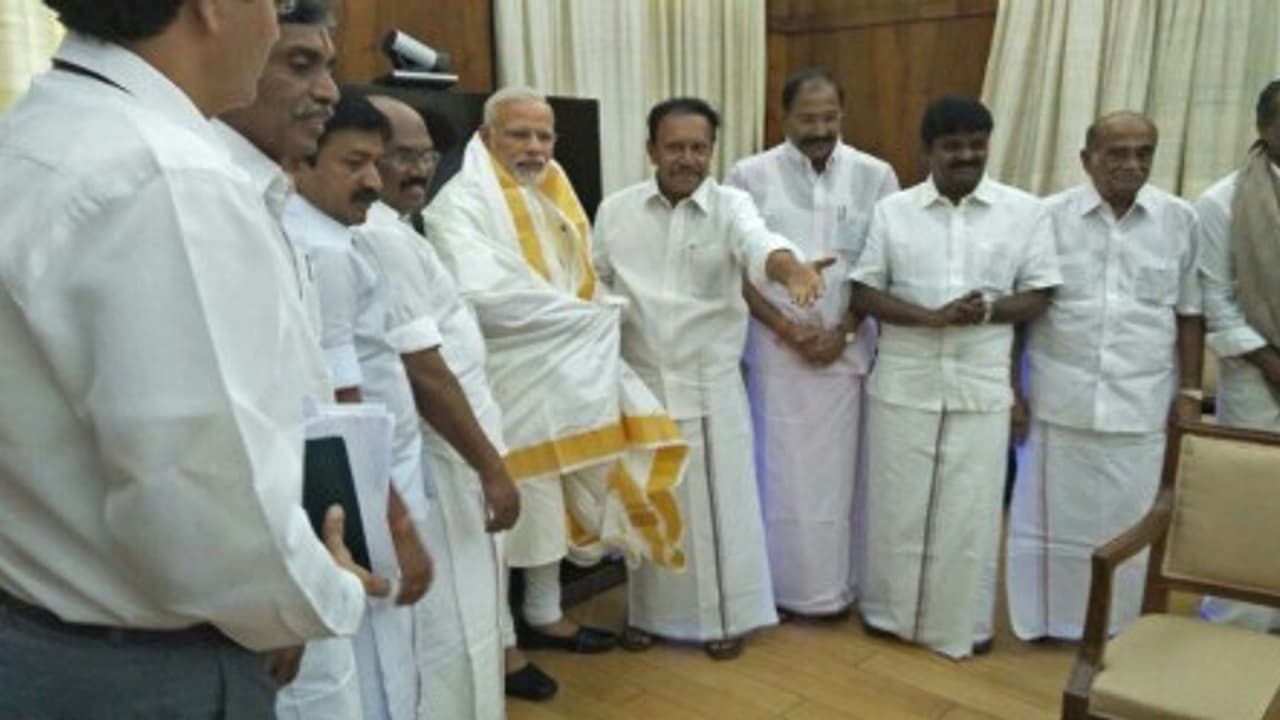 மக்களவை துணைச் சபாநாயகர் தம்பிதுரை, எம்.பி. நவநீத கிருஷ்ணன் மற்றும் அமைச்சர்கள் ஜெயக்குமார், அன்பழகன், சிவி சண்முகம், தங்கமணி, விஜயபாஸ்கர், உள்ளிட்ட தமிழக அமைச்சர்கள் பிரதமர் நரேந்திர மோடியை நேரில் சந்தித்துப் பேசினர்.