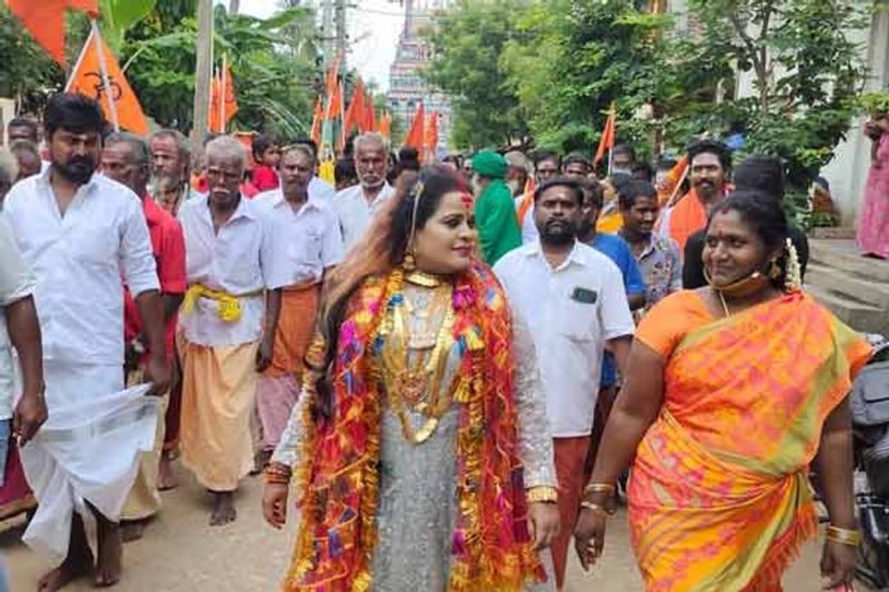 இந்நிலையில் இவர் திருவண்ணாமலை மகா தீபத்தை தரிசனம் செய்வதற்காக திருவண்ணாமலைக்கு இன்று வந்தார். வழக்கம் போல் முகத்தில் புல் மேக்கப், உதட்டில் டார்க் லிப்ஸ்டிக் , ஹர் கலரிங், நிறைய தங்க நகைகளை அணிந்து இருந்தார். சொகுசு காரில் வந்திறக்கிய இவர், காளி கோவிலில் சாமி தரிசனம் செய்து விட்டு கிரிவலம் சென்றார். முன்னதாக அவர் கோவிலுக்கு வந்த பக்தர்களுக்கு குங்கும திலகமிட்டு ஆசி வழங்கினார். அவர் கூறும்போது, சிறுவயதில் காளிமாதா மீது எனக்கு பக்தி ஏற்பட்டது. அதுமுதல் காளிமாதா வழிபாட்டில் ஈடுபட்டு வருகிறேன். இரவில் மயானம் சென்றும் வழிபாடு செய்வேன்.