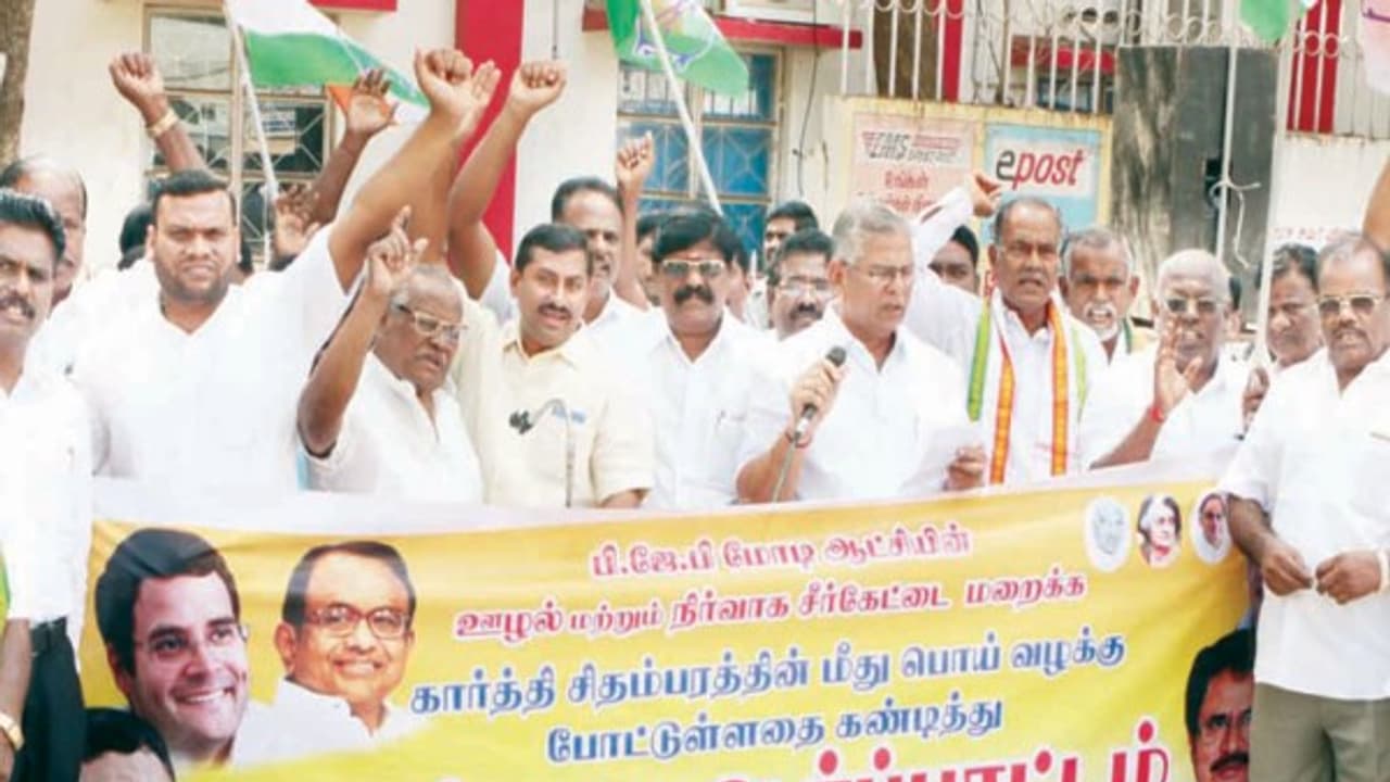 இந்த ஆர்ப்பாட்டத்தில், "முன்னாள் மத்திய மந்திரி ப.சிதம்பரத்தின் மகன் கார்த்தி சிதம்பரத்தை கைது செய்ததை கண்டிப்பது,