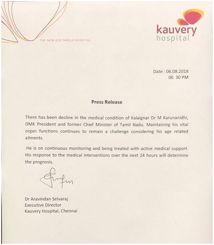 இந்நிலையில் தற்போது வெளியாகி உள்ள, மருத்துவமனை அறிக்கையில், கலைஞரின் உடல் நிலை கவலைகிடமாக உள்ளது என்றும் எடுத்த 24 மணி நேரம் கழித்தே எதையும் சொல்ல முடியும் என்றும் தெரிவித்து உள்ளது காவேரி மருத்துவமனை. மேலும், வயது மூப்பு காரணமாக உடல் உறுப்புகளை செயல்பட வைப்பது பெரும் சவாலாக உள்ளது என்றும் மருத்துவர்கள் அறிக்கை வெளியிட்டு உள்ளனர்