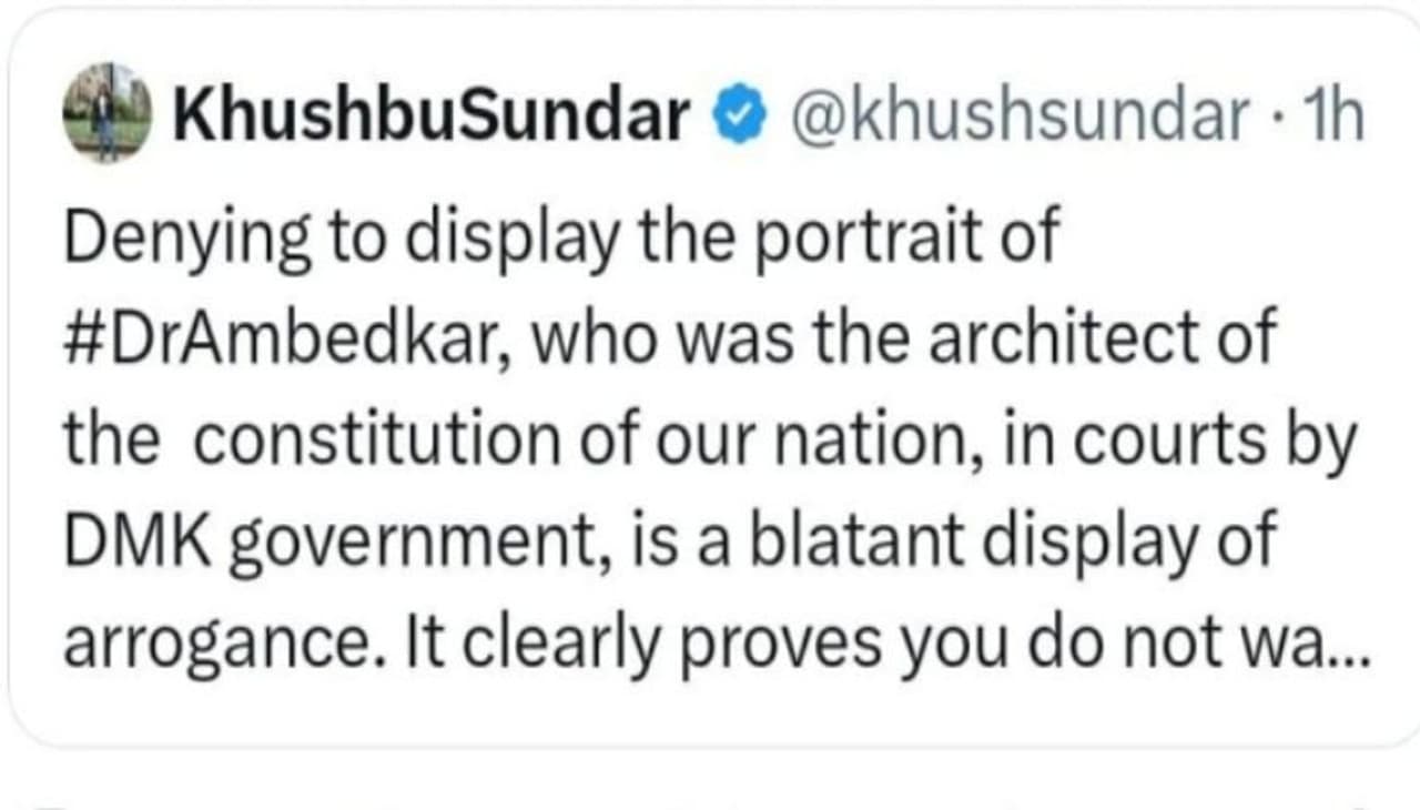 இந்நிலையில் இந்த விவகாரத்தில் தனது கருத்தினை இன்று தெரிவித்திருந்த நடிகையும், பாஜக தலைவருமான குஷ்பூ. திமுக அரசின் ஆணவத்தைத் தான் இந்த செயல் காட்டுகிறது. அரசியல் சாசன சட்டத்தை கொடுத்த அம்பேத்கர் படத்தை வைப்பதில் என்ன தவறு என்று கூறி மிக கடுமையான பதிவு ஒன்றை தனது ட்விட்டர் பக்கத்தில் போட்டிருந்தார்.