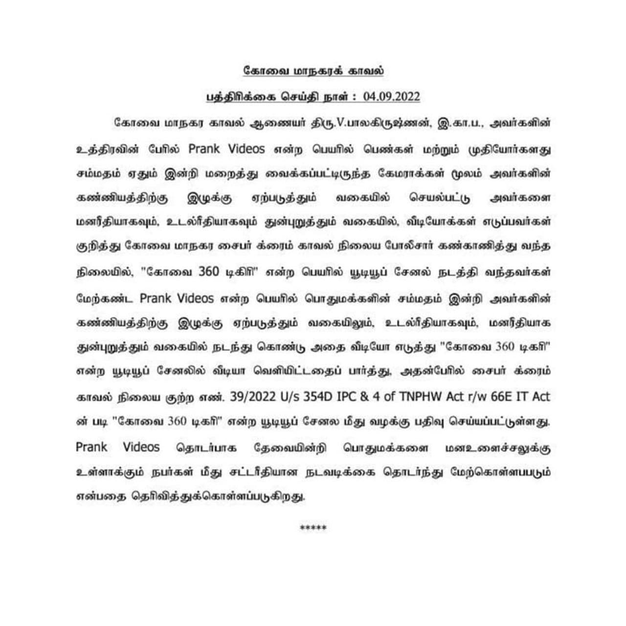 பிராங்க் வீடியோக்களை பதிவிடும் யூ டியுப் சேனல்களின் எண்ணிக்கையும் அதிகரித்தே வருகிறது. இந்த நிலையில் பிராங்க் வீடியோ எடுத்து சம்பந்தப்பட்ட நபரின் ஒப்புதல் இன்றி யூடியூபில் பதிவேற்றினால் குற்றவியல் நடவடிக்கை எடுக்கப்படும் என கோவை காவல்துறை எச்சரித்துள்ளது. இதுதொடர்பாககோவை மாநகர காவல்துறை வெளியிட்டுள்ள அறிக்கை ஒன்றினை வெளியிட்டு உள்ளது.
