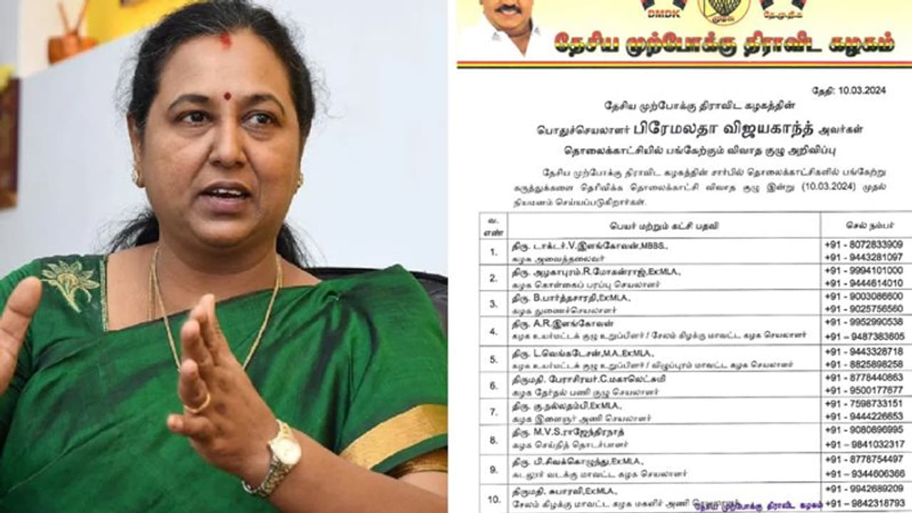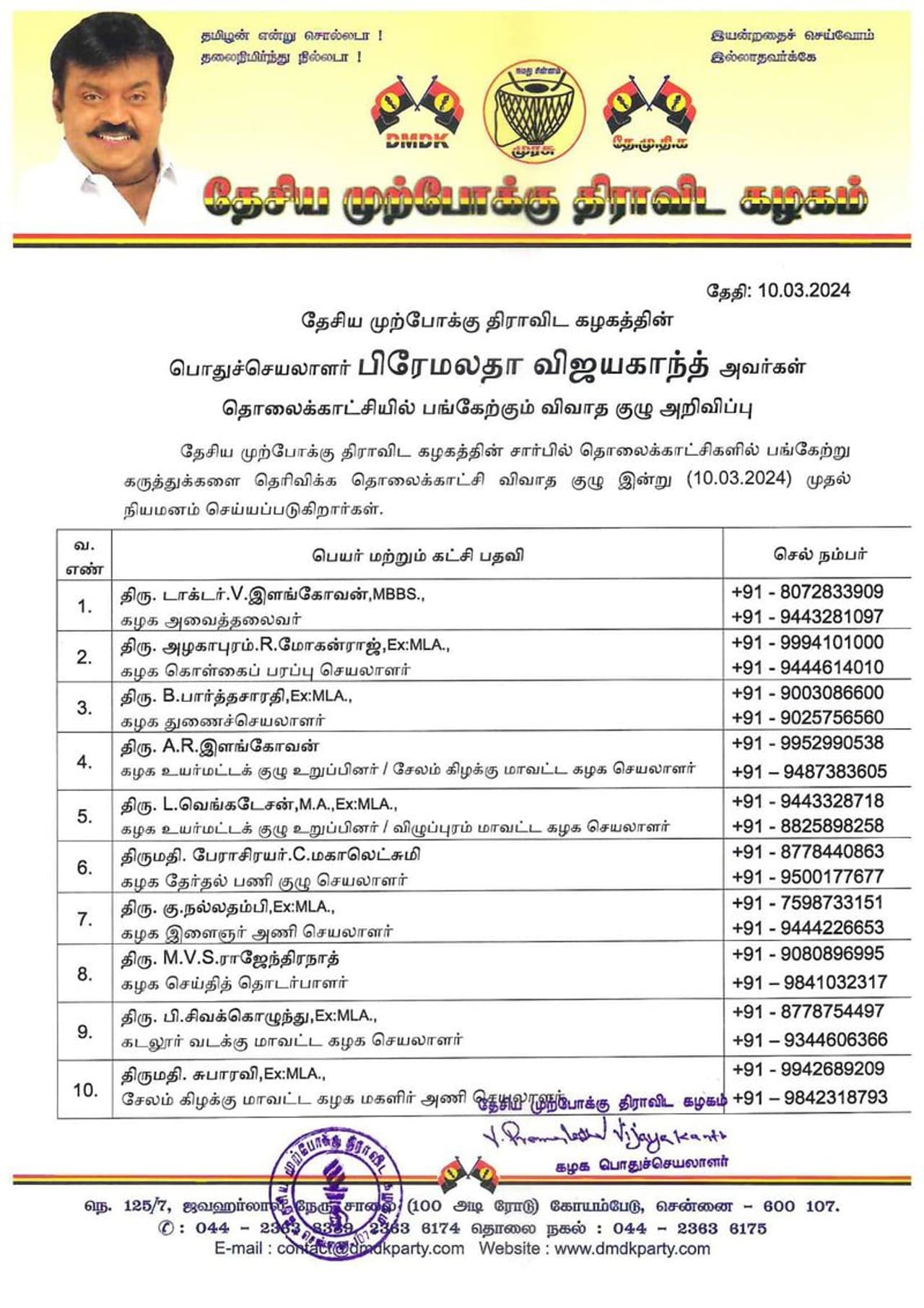 தேமுதிக சார்பில் தொலைக்காட்சி விவாதங்களில் பங்கேற்போர் பட்டியலை அக்கட்சியின் பொதுச்செயலாளர் பிரேமலதா விஜயகாந்த் அறிவித்துள்ளார்.