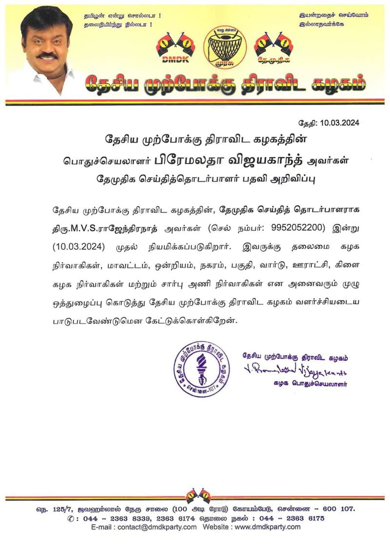 இதுதொடர்பாக தேமுதிக பொதுச்செயலாளர் பிரேமலதா விஜயகாந்த் வெளியிட்டுள்ள அறிவிப்பில்: தேசிய முற்போக்கு திராவிட கழகத்தின், தேமுதிக செய்தித் தொடர்பாளராக M.V.S.ராஜேந்திரநாத் அவர்கள் (செல் நம்பர்: 9952052200) இன்று (10.03.2024) முதல் நியமிக்கப்படுகிறார். இவருக்கு தலைமை கழக நிர்வாகிகள், மாவட்டம், ஒன்றியம், நகரம், பகுதி, வார்டு, ஊராட்சி, கிளை கழக நிர்வாகிகள் மற்றும் சார்பு அணி நிர்வாகிகள் என அனைவரும் முழு ஒத்துழைப்பு கொடுத்து தேசிய முற்போக்கு திராவிட கழகம் வளர்ச்சியடைய பாடுபடவேண்டுமென கேட்டுக்கொள்கிறேன் என தெரிவித்துள்ளார்.