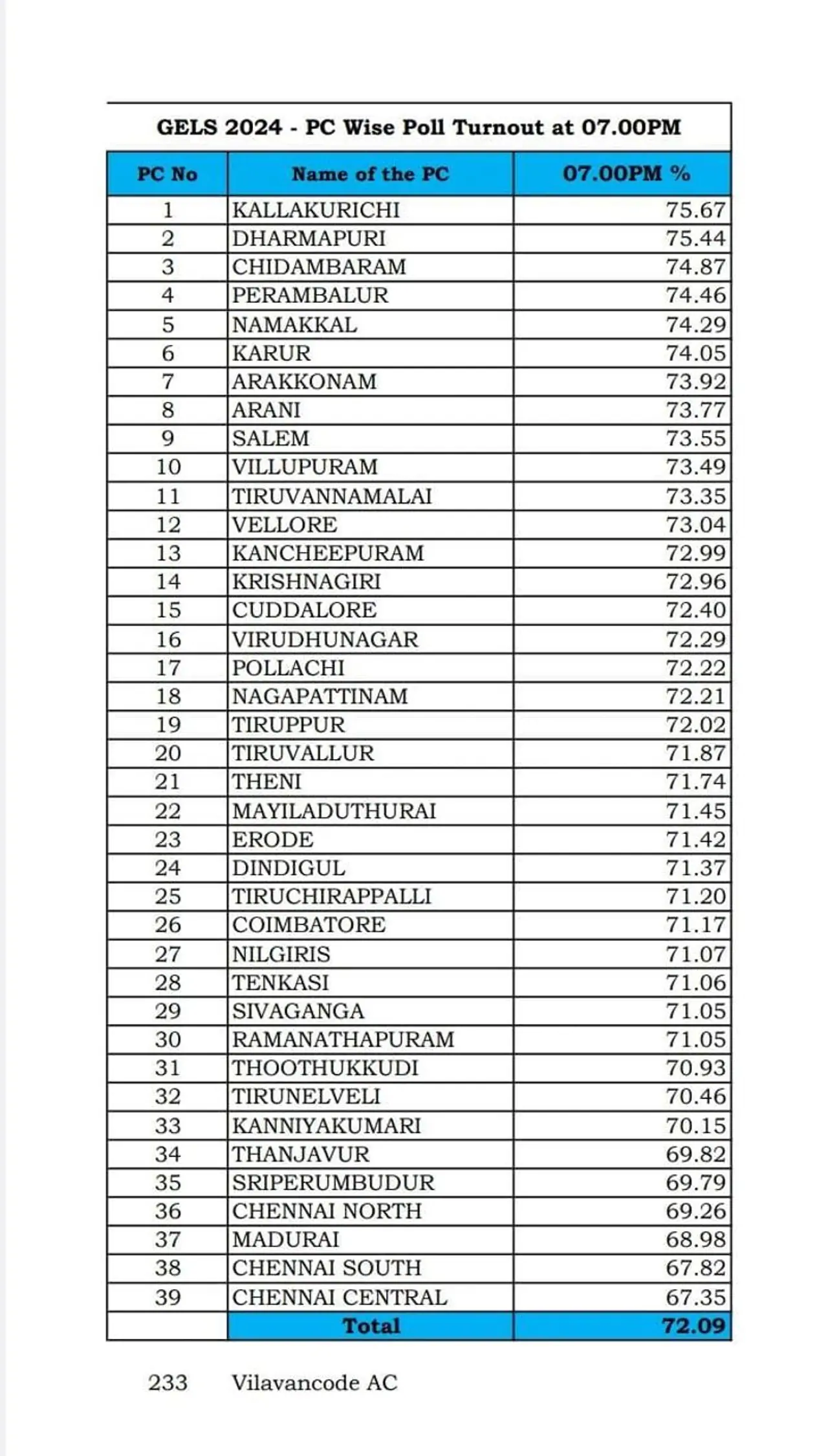 அதிகபட்சமாக கள்ளக்குறிச்சியில் 75.67 வாக்கு சதவிகிதமும், குறைந்தபட்சமாக மத்திய சென்னையில் 67.35% வாக்குகளும் பதிவு. கள்ளக்குறிச்சிக்கு அடுத்தபடியாக தர்மபுரி நாடாளுமன்ற தொகுதியில் 75.44%, சிதம்பரம் நாடாளுமன்ற தொகுதியில் 74.87 சதவிகிதமும் வாக்குப்பதிவாகியுள்ளது.