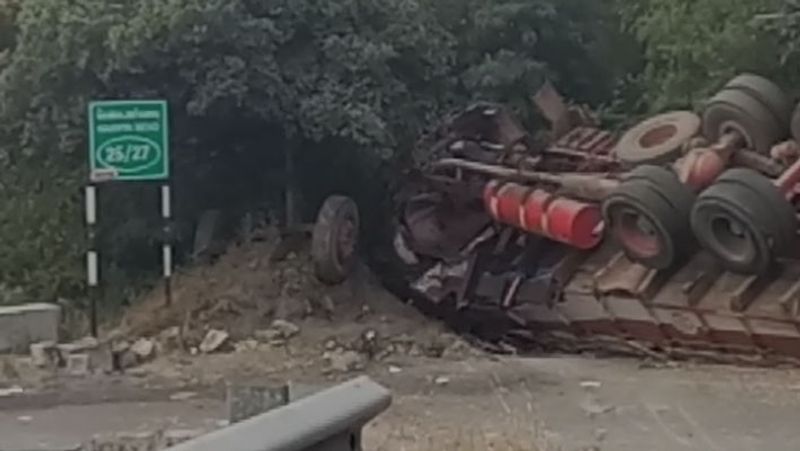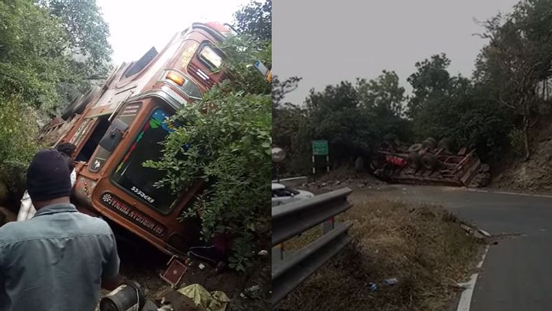 இந்நிலையில் இன்று காலை மக்காச்சோளம் ஏற்றிக்கொண்டு லாரி பல்லடம் செல்வதற்காக திம்பம் மலைப்பாதை வழியாக சென்றுகொண்டிருந்தது. இந்த லாரியை மகேந்திரன் என்பவர் ஓட்டி வந்துள்ளார். 25-வது கொண்டை ஊசி வளைவு அருகே சென்றிக்கொண்டிருந்த போது திடீரென கட்டுப்பாட்டை இழந்தது. இதனையடுத்து சாலையோரத்தில் இருந்த தடுப்பு சுவரில் மோதி லாரி தலைக்குப்புற கவிழ்ந்தது.