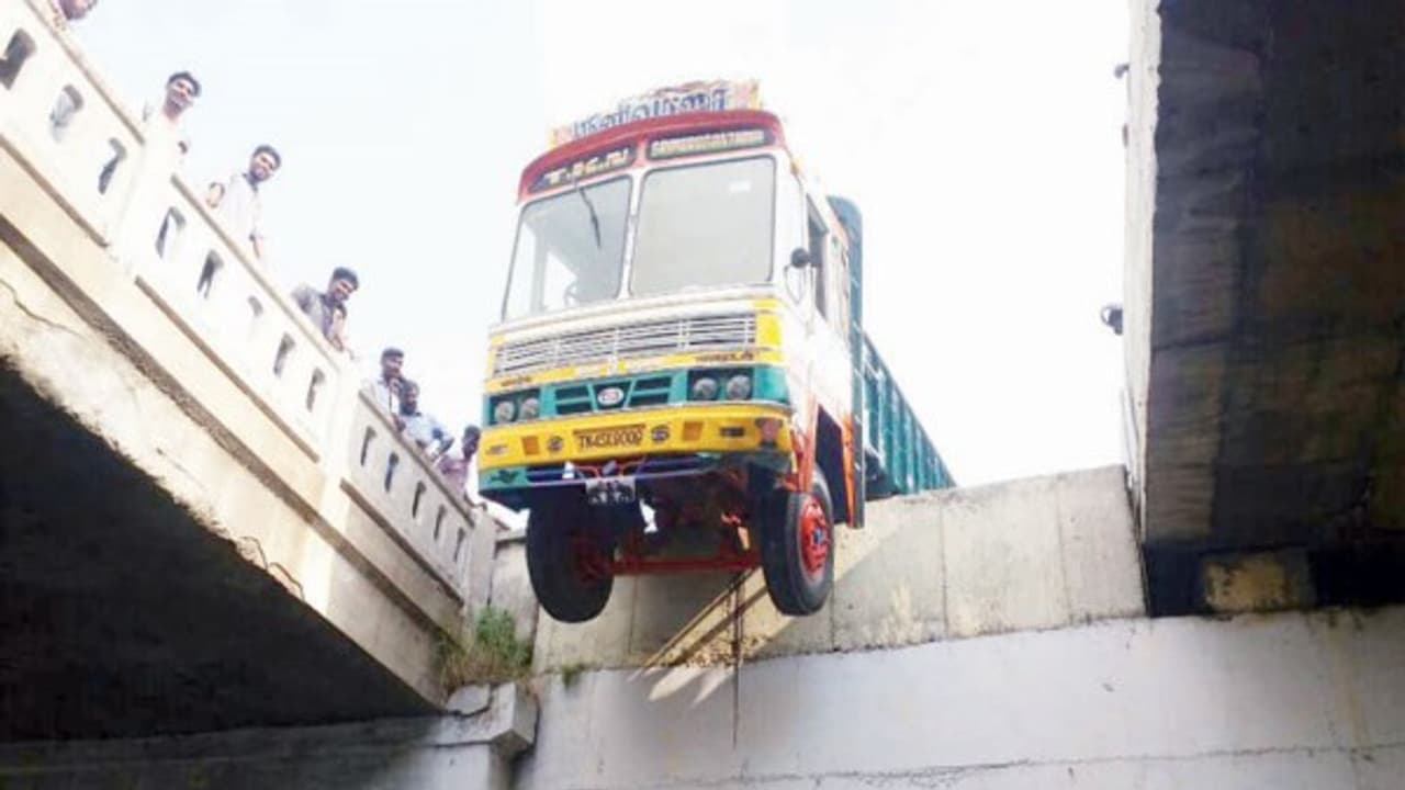 மேலும், அந்தரத்தில் தொங்கிய லாரியில் இருந்த ஓட்டுநர் சாதாசிவம் காப்பாற்றுங்கள், காப்பாற்றுங்கள் என கூச்சலிட்டதால் அவரை சுற்றியிருந்த மக்கள் மீட்டனர்.
