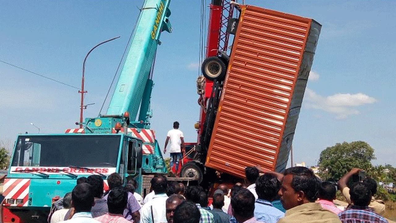அப்பகுதியில் வாகன போக்குவரத்து தடை செய்யப்பட்டது. சம்பவ இடத்திற்கு 40-க்கும் மேற்பட்ட தீயணைப்பு வீரர்கள் வந்தனர். மேலும் காவிரி கரையோரம் வசிக்கும் மீனவர்களின் உதவியை நாடினார்கள். மீனவர்கள் லாரி விழுந்த பகுதியில் மூழ்கினார்கள். ஆனால், ஆற்றில் நீரின் அழுத்தம் அதிகமாக இருந்ததால் அவர்களால் ஆற்றின் அடிப்பகுதி வரை செல்ல முடியவில்லை. நீரில் மூழ்கிய அவர்கள் எந்த ஊரு லாரி? என்பது குறித்தும், வண்டி எண்? குறித்தும் அடையாளம் கண்டனர். இந்த லாரி பூந்தமல்லியை சேர்ந்தது என்பது கண்டுபிடிக்கப்பட்டது. இதனை மீட்க 2 பெரிய ராட்சத கிரேன்கள் வரவழைக்கப்பட்டு லாரியை மீட்டனர். இதனிடையே லாரியில் இருந்து ஓட்டுநர் சடலமாக மீட்கப்பட்டுள்ளார்.