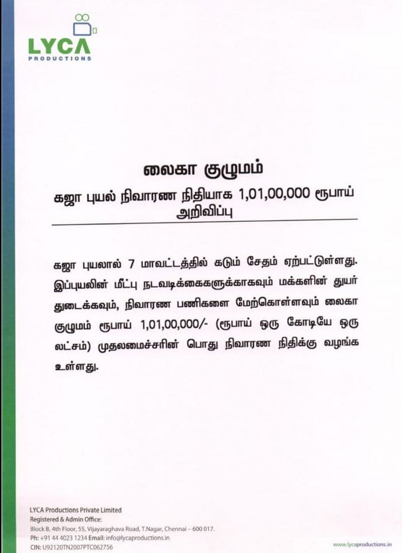இதுகுறித்து அந்த நிறுவனம் வெளியிட்டுள்ள அறிக்கையில்; காஜா புயலால் 7 மாவட்டத்தில் கடும் சேதம் ஏற்பட்டுள்ளது. இப்புயலின் மீட்டப்பு நடவடிக்கைக்காகவும், மக்களின் துயர் துடைக்கவும் நிவாரணப்பணிகளை மேற்கொள்ளவும், லைகா குழுமம் ரூபாய் (1,01,00,000) ரூபாய் ஒருகோடியே ஒரு லட்சம் முதலமைச்சரின் பொது நிவாரண நிதிக்கு வழங்கப்படுகிறது.இவ்வாறு அந்த அறிக்கையில் கூறப்பட்டுள்ளது.