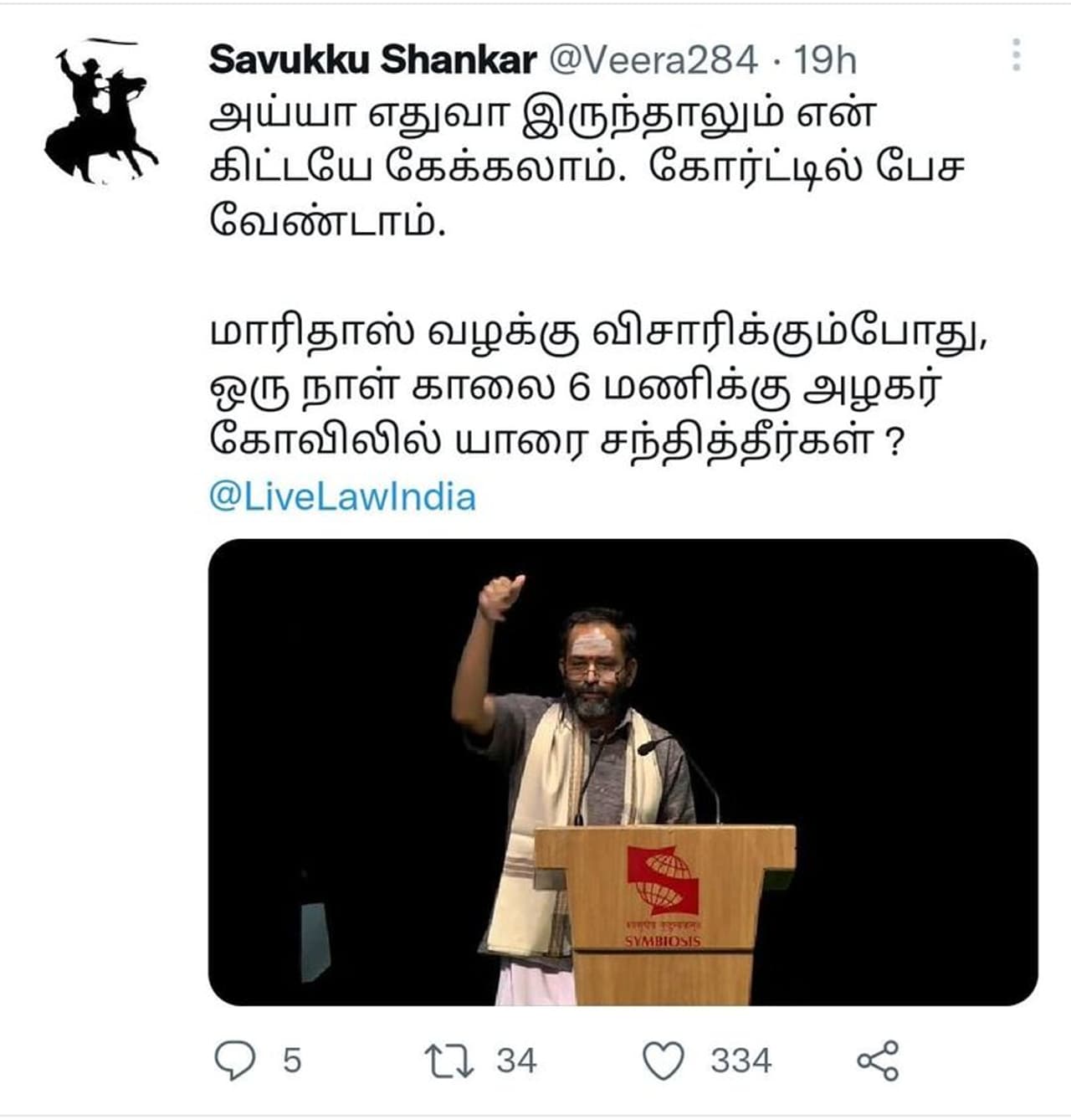 இந்நிலையில், சவுக்கு சங்கர் மீது நீதிமன்ற அவமதிப்பு வழக்கு பதிவு செய்ய மதுரை நீதிமன்ற நீதிபதி ஜி.ஆர்.சுவாமிநாதன் உத்தரவு பிறப்பித்து்ள்ளார். நீதிமன்ற அவமதிப்பு வழக்கு பதிவு செய்ய மதுரைக்கிளை பதிவாளருக்கு அவர் உத்தரவிட்டுள்ளார். தன்னைப் பற்றி சமூக வலைதளத்தில் அவதூறு கருத்து பதிவிட்ட குற்றச்சாட்டில், தாமாக முன்வந்து நீதிமன்ற அவமதிப்பு வழக்கு பதிவு செய்வதாக நீதிபதி ஜி.ஆர்.சுவாமிநாதன் தெரிவித்துள்ளார். கடந்த இரண்டு தினங்களுக்கு முன்பு சவுக்கு சங்கர் பதிவிட்ட டுவிட்டர் பதிவில் அய்யா எதுவா இருந்தாலும் என் கிட்டயே கேக்கலாம். கோர்ட்டில் பேச வேண்டாம். மாரிதாஸ் வழக்கு விசாரிக்கும்போது, ஒரு நாள் காலை 6 மணிக்கு அழகர் கோவிலில் யாரை சந்தித்தீர்கள் ? என சவுக்கு சங்கர் நீதிபதி ஜி.ஆர்.சுவாமிநாதன் படத்தை பதிவிட்டு கேள்வி எழுப்பி இருந்தார். எனவே இந்த டுவிட்டர் பதிவிற்காகத்தான் நீதிமன்ற அவமதிப்பு வழக்கு தொடரப்பட்டதாக நெட்டிசன்கள் பேசி வருகின்றனர்.