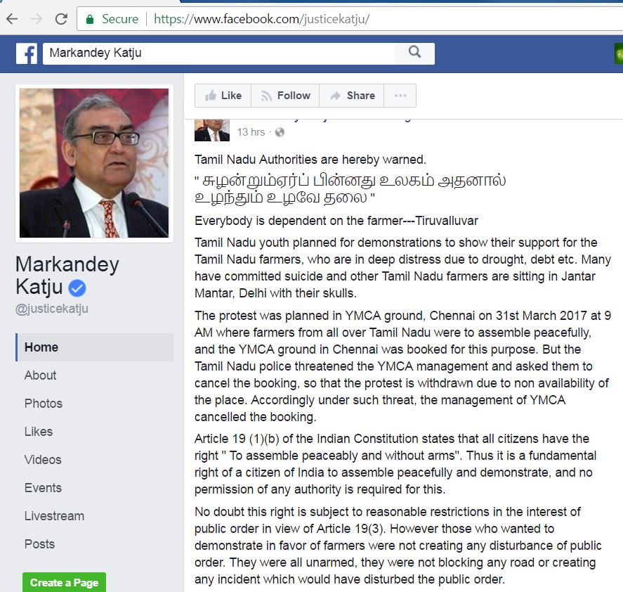 தமிழர்களுக்கு ஆதரவாக எப்போதும் குரல் கொடுப்பவர் மார்க்கண்டேய கட்ஜு. இவர் எப்போதும் தமிழக அரசியல் குறித்தும், தமிழகத்தில் நடக்கும் பிரச்சனைகளை குறித்தும் பல்வேறு கருத்துக்களை தனது ஃபேஸ்புக் பக்கத்தில் குறிப்பிடுவார்.