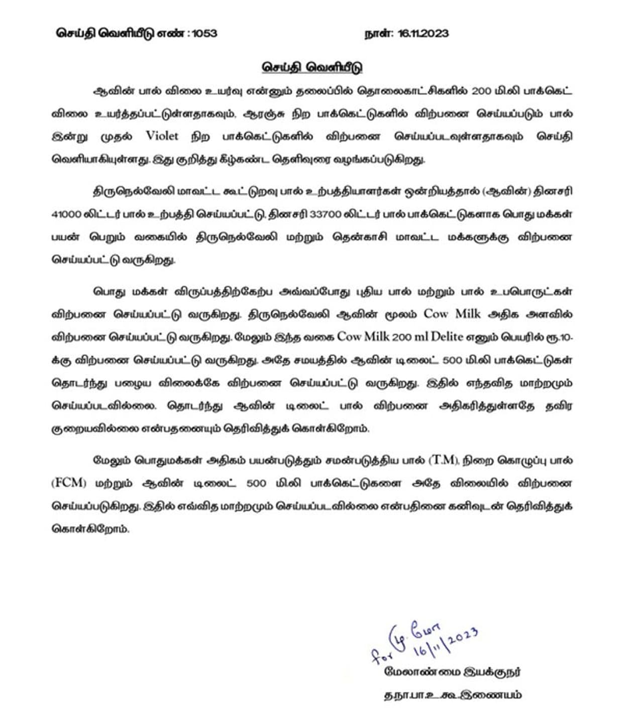 அதில், ஆவின் பால் விலை உயர்வு என்னும் தலைப்பில் தொலைகாட்சிகளில் 200 மி.லி பாக்கெட் விலை உயர்த்தப்பட்டுள்ளதாகவும், ஆரஞ்சு நிற பாக்கெட்டுகளில் விற்பனை செய்யப்படும் பால் இன்று முதல் Violet நிற பாக்கெட்டுகளில் விற்பனை செய்தி வெளியாகியுள்ளது. இது குறித்து கீழ்கண்ட தெளிவுரை வழங்கப்படுகிறது. திருநெல்வேலி மாவட்ட கூட்டுறவு பால் உற்பத்தியாளர்கள் ஒன்றியத்தால் (ஆவின்) தினசரி 41000 லிட்டர் பால் உற்பத்தி செய்யப்பட்டு, தினசரி 33700 லிட்டர் பால் பாக்கெட்டுகளாக பொது மக்கள் பயன் பெறும் வகையில் திருநெல்வேலி மற்றும் தென்காசி மாவட்ட மக்களுக்கு விற்பனை செய்யப்பட்டு வருகிறது.