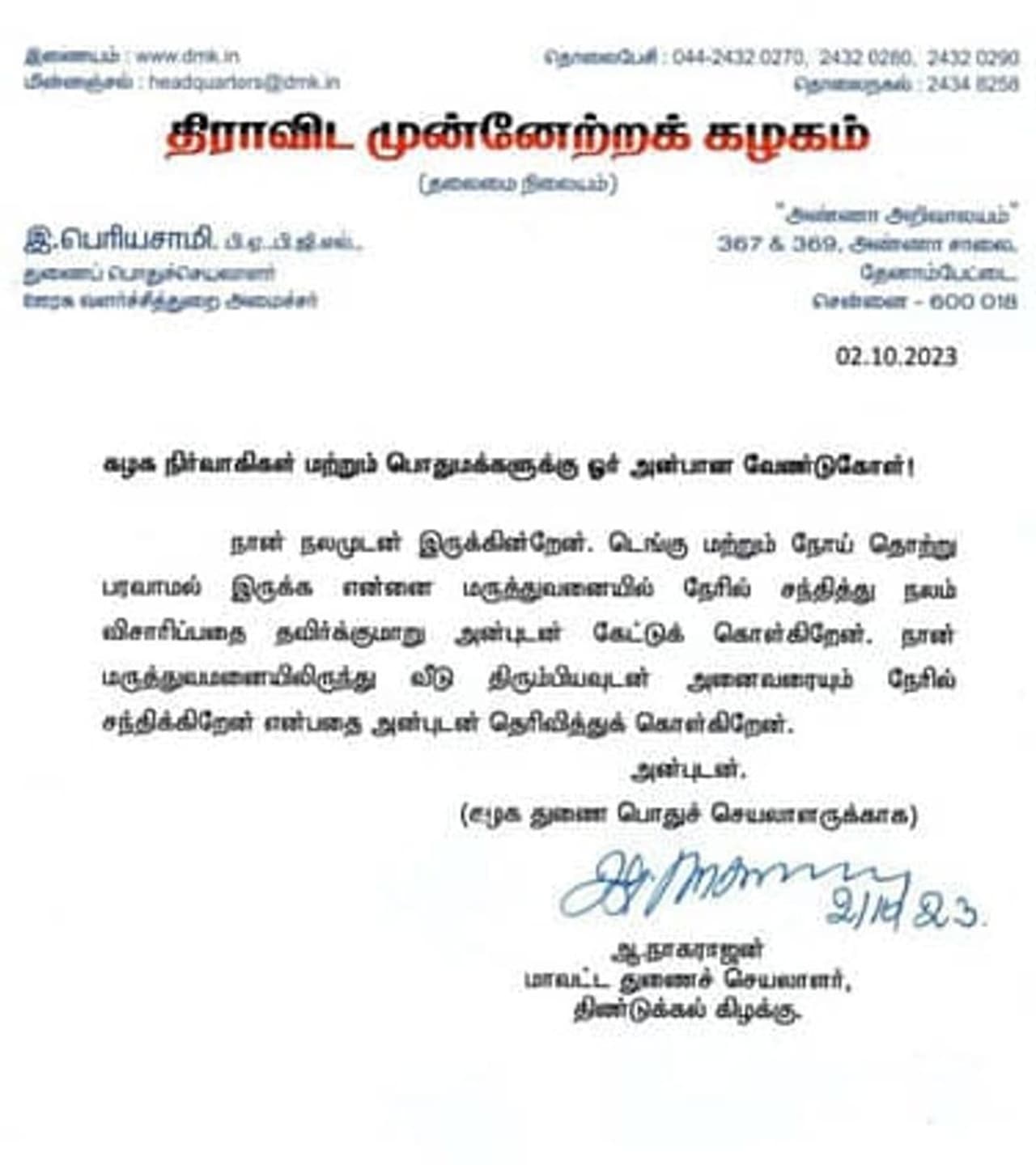 இந்த நிலையில்தான் மருத்துவமனையில் சிகிச்சை பெற்று வரும் அமைச்சர் ஐ.பெரியசாமியின் லெட்டர் பேடில் இருந்து திண்டுக்கல் கிழக்கு மாவட்ட திமுக துணைச்செயலாளர் நாகராஜன் வெளியிட்டுள்ள அறிக்கையில், தான் நலமாக இருப்பதாகவும் டெங்கு மற்றும் தொற்று நோய் பரவாமல் இருக்க தன்னை நேரில் சந்தித்து நலம் விசாரிப்பதை தவிர்க்கவும், சிகிச்சை முடிந்து வீடு திரும்பியவுடன் அனைவரையும் நேரில் சந்திப்பதாக அந்த அறிக்கையில் அமைச்சர் ஐ.பெரியசாமி தெரிவித்து இருக்கிறார்.