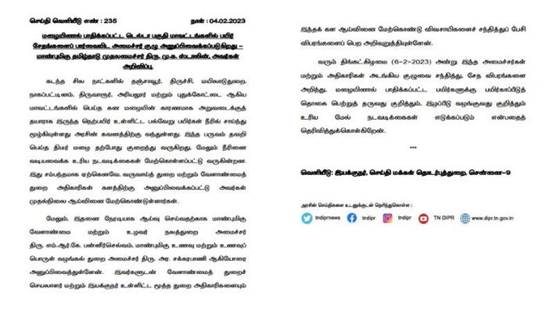 மேலும், இதனை நேரடியாக ஆய்வு செய்வதற்காக வேளாண்மை மற்றும் உழவர் நலத்துறை அமைச்சர் எம்.ஆர்.கே. பன்னீர்செல்வம், உணவு மற்றும் உணவுப் பொருள் வழங்கல் துறை அமைச்சர் அர. சக்கரபாணி ஆகியோரை அனுப்பிவைத்துள்ளேன். இவர்களுடன் வேளாண்மைத் துறைச் செயலாளர் மற்றும் இயக்குநர் உள்ளிட்ட மூத்த துறை அதிகாரிகளையும் இந்தக் கள ஆய்வினை மேற்கொண்டு விவசாயிகளைச் சந்தித்துப் பேசி விபரங்களைப் பெற அறிவுறுத்தியுள்ளேன்.