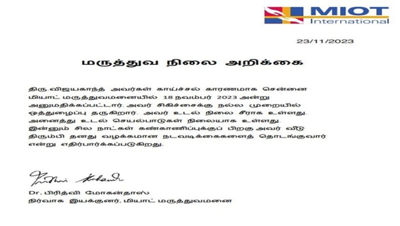 இந்த நிலையில், விஜயகாந்த் உடல்நிலை எப்படி இருக்கிறது என்பது பற்றி மியாட் மருத்துவமனை அறிக்கை வெளியிட்டுள்ளது. அதில், விஜயகாந்த் சிகிச்சைக்கு நல்ல முறையில் ஒத்துழைப்பு தருவதாகவும், அவரது உடல்நிலை சீராக உள்ளதாகவும் தெரிவிக்கப்பட்டுள்ளது. விஜயகாந்தின் அனைத்து உடல் செயல்பாடுகளும் நிலையாக உள்ளது என தெரிவித்துள்ள மியாட் மருத்துவமனை, இன்னும் சில நாட்கள் கண்காணிப்புக்கு பிறகு அவர் வீடு திரும்பி தனது வழக்கமான நடவடிக்கைகளை தொடங்குவார் என்று எதிர்பார்க்கப்படுவதாகவும் தெரிவித்துள்ளது.