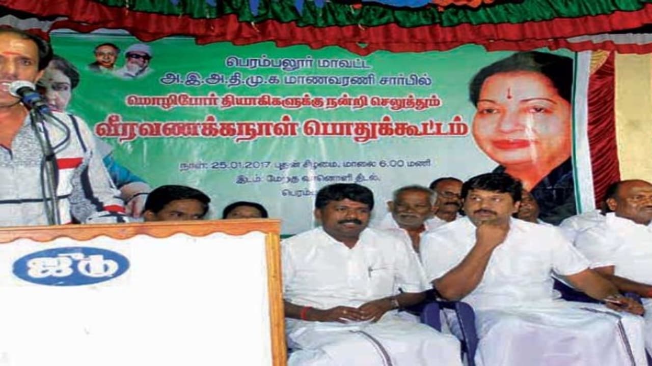 பெரம்பலூர் மாவட்ட அதிமுக மாணவரணி சார்பில் மொழிப்போர் தியாகிகளுக்கு வீரவணக்க நாள் பொதுக் கூட்டம், பெரம்பலூர் மேற்கு வானொலித் திடலில் நடைப்பெற்றது.