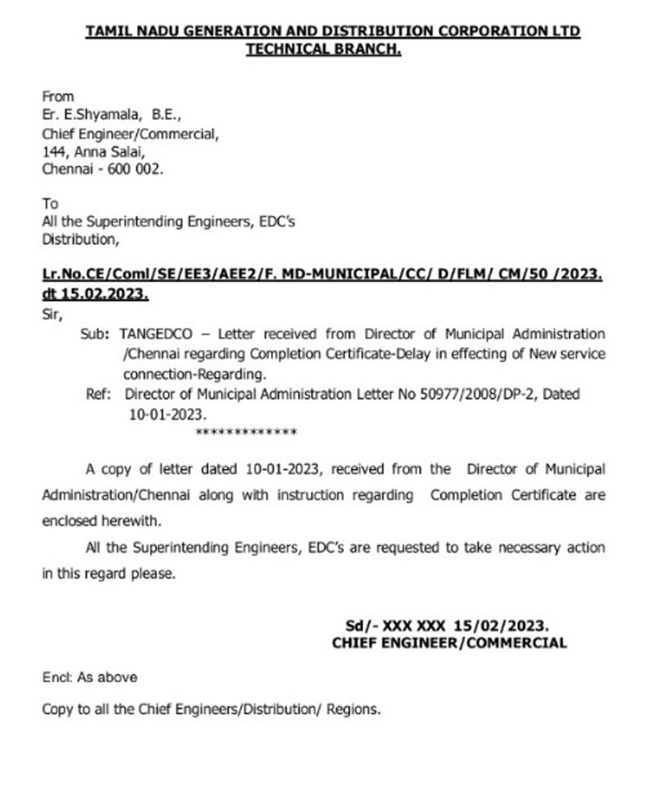 அதில், அனைத்து வீடுகள், தொழிற்சாலை கட்டடங்கள் அனைத்திற்கும் மின் இணைப்பு வசதி, குடிநீர் குழாய் வசதி, பாதாள சாக்கடை இணைப்பு வசதி பெற கட்டட முடிவு சான்று கிடைக்கும் வரை காத்திருக்க வேண்டிய அவசியமில்லையென தெரிவிக்கப்பட்டுள்ளது. நகராட்சி நிர்வாகத்துறை உத்தரவை அமல்படுத்துவதால் இனி கட்டட முடிவு சான்று இல்லாமலே மின் இணைப்பு வசதியும் பெறலாம் என மின்சார வாரியமும் புதிய உத்தரவிட்டுள்ளது.