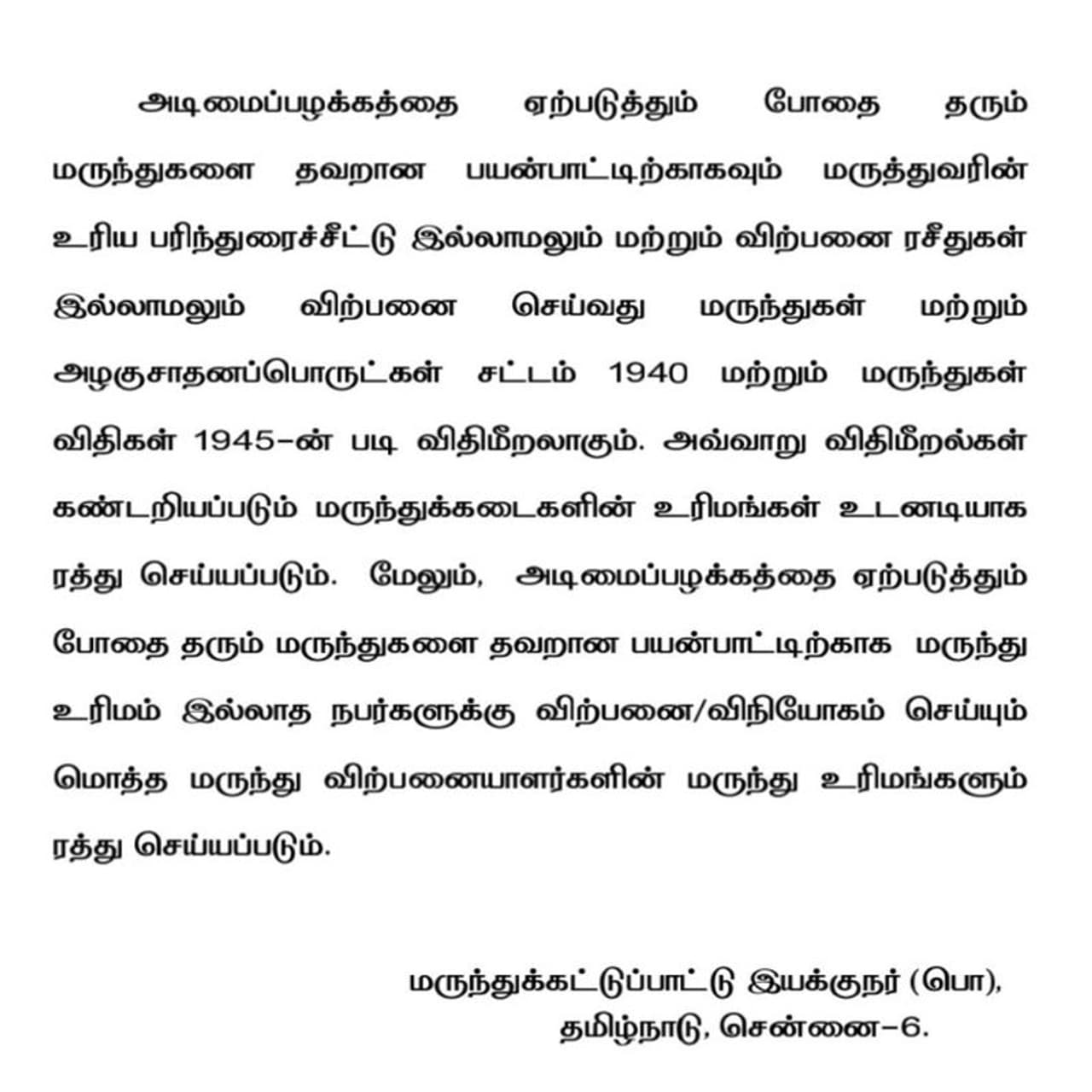 அவ்வாறு விதிமீறல்கள் கண்டறியப்படும் மருந்துக்கடைகளின் உரிமங்கள் உடனடியாக ரத்து செய்யப்படும். மேலும், அடிமைப்பழக்கத்தை ஏற்படுத்தும் போதை தரும் மருந்துகளை தவறான பயன்பாட்டிற்காக மருந்து உரிமம் இல்லாத நபர்களுக்கு விற்பனை/விநியோகம் செய்யும் மொத்த மருந்து விற்பனையாளர்களின் மருந்து உரிமங்களும் ரத்து செய்யப்படும்’ என்று அதில் கூறப்பட்டுள்ளது.