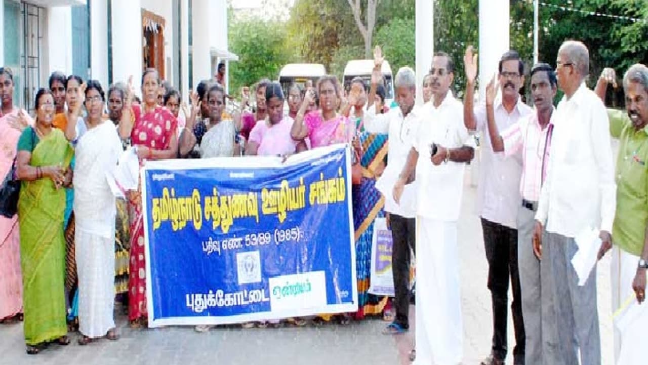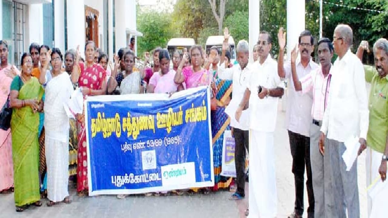 புதுக்கோட்டை மாவட்டம், புதுக்கோட்டை ஊராட்சி ஒன்றிய அலுவலகத்தில் தமிழ்நாடு சத்துணவு ஊழியர் சங்கத்தினர் நேற்று ஆர்ப்பாட்டத்தில் ஈடுப்பட்டனர்.