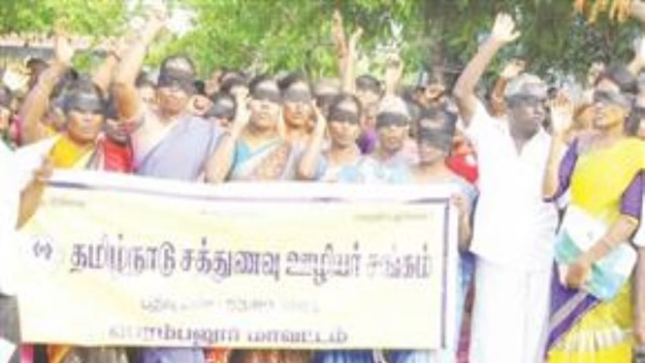 தமிழ்நாடு சத்துணவு ஊழியர் சங்கத்தினர் கண்களை கருப்பு துணியால் கட்டிக்கொண்டு பெரம்பலூர் மாவட்ட ஆட்சியர் அலுவலகம் எதிரில் ஆர்ப்பாட்டத்தில் ஈடுபட்டனர்.