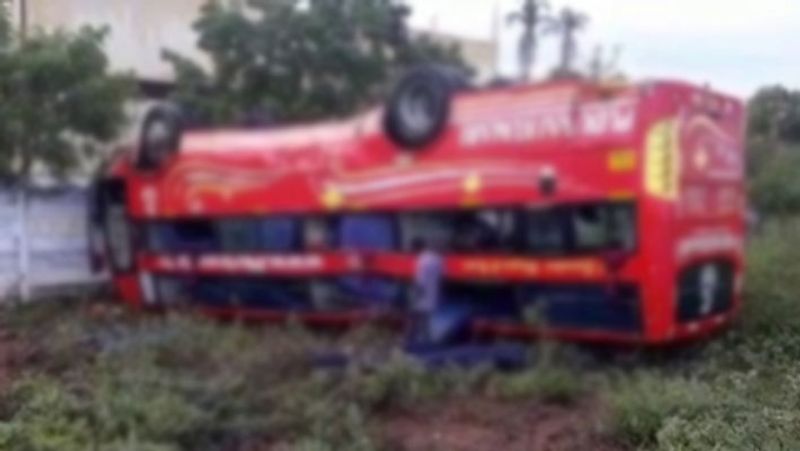 வேலூர் அடுத்த மோட்டூர் என்ற பகுதியில் பஸ் சென்று கொண்டிருந்தது. அப்போது திடீரென பஸ், டிரைவரின் கட்டுப்பாட்டை இழந்து சாலை தடுப்புகளின் மீது மோதி நடுரோட்டில் கவிழ்ந்தது.