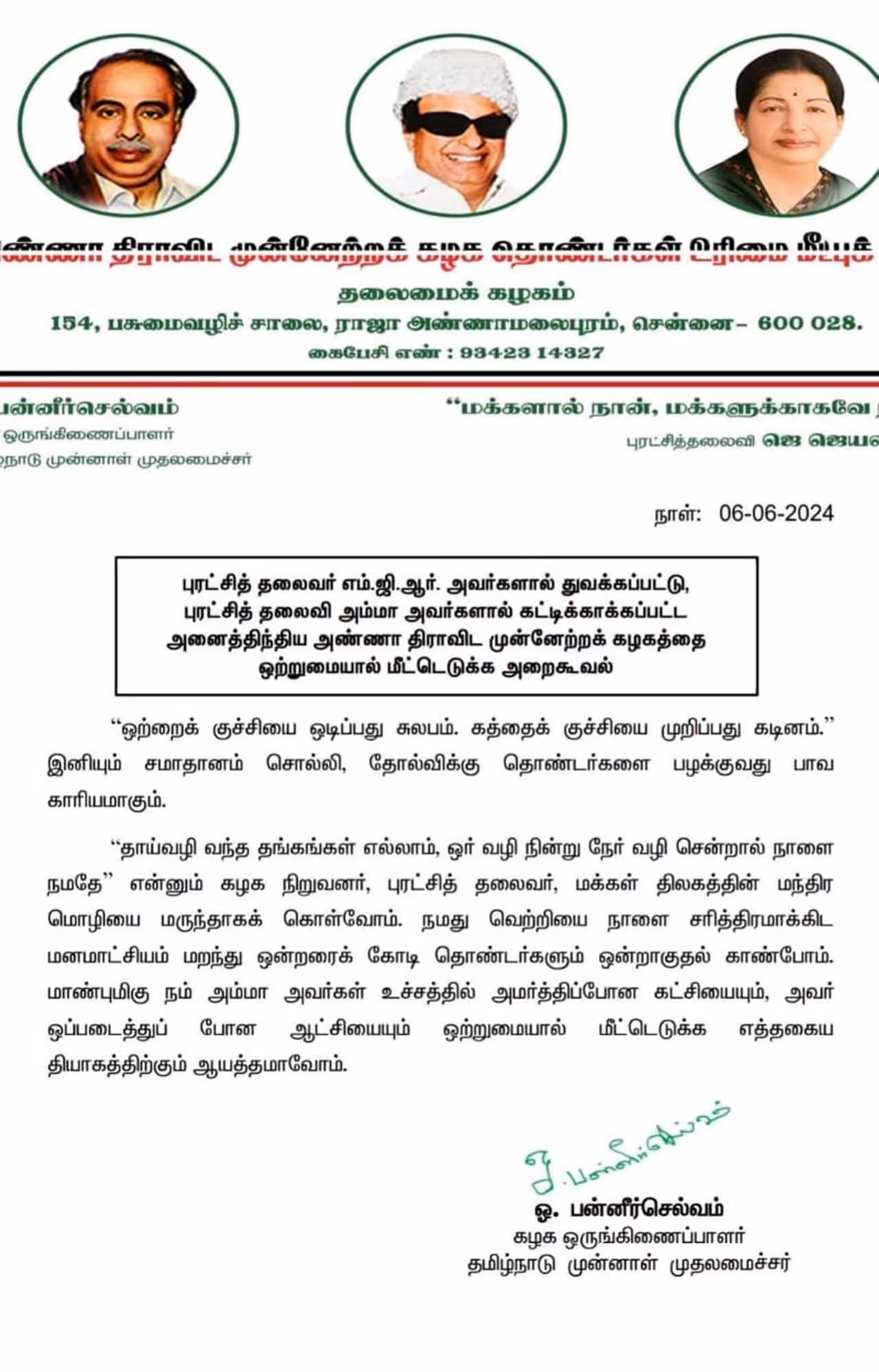 "தாய்வழி வந்த தங்கங்கள் எல்லாம், ஒர் வழி நின்று நேர் வழி சென்றால் நாளை நமதே” என்னும் கழக நிறுவனர், புரட்சித் தலைவர், மக்கள் திலகத்தின் மந்திர மொழியை மருந்தாகக் கொள்வோம். நமது வெற்றியை நாளை சரித்திரமாக்கிட மனமாட்சியம் மறந்து ஒன்றரைக் கோடி தொண்டர்களும் ஒன்றாகுதல் காண்போம். மாண்புமிகு நம் அம்மா அவர்கள் உச்சத்தில் அமர்த்திப்போன கட்சியையும், அவர் ஒப்படைத்துப் போன ஆட்சியையும் ஒற்றுமையால் மீட்டெடுக்க எத்தகைய தியாகத்திற்கும் ஆயத்தமாவோம் என ஓ.பன்னீர் செல்வம் தெரிவித்துள்ளார்.