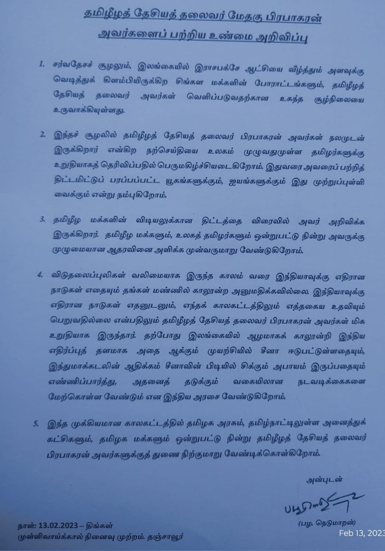 தஞ்சாவூர் விளார் கிராமத்தில் உள்ள முள்ளிவாய்க்கால் நினைவு முற்றத்தில் ஈழத் தமிழர் பிரச்சனை குறித்து முக்கியமான அறிவிப்பை உலக தமிழர் பேரமைப்பு தலைவர் பழ. நெடுமாறன் வெளியிட இருப்பதாக வெளியிட இருப்பதாக தகவல் வெளியானது. இதன் காரணமாக பரபரப்பு சூழல் ஏற்பட்ட நிலையில் உலக தமிழர் பேரமைப்பு தலைவர் பழ. நெடுமாறன் செய்தியாளர் சந்தித்தார். அப்போது .சர்வதேசச் சூழலும், இலங்கையில் ராஜபட்ஷே ஆட்சியை வீழ்த்தும் அளவுக்கு வெடித்துக் கிளம்பியிருக்கிற சிங்கள மக்களின் போராட்டங்களும், தமிழீழத் தேசியத் தலைவர் வெளிப்படுவதற்கான உகந்த சூழ்நிலையை உருவாக்கியுள்ளது. இந்தச் சூழலில் தமிழீழத் தேசியத் தலைவர் பிரபாகரன் நலமுடன் இருக்கிறார் என்கிற நற்செய்தியை உலகம் முழுவதுமுள்ள தமிழர்களுக்கு உறுதியாகத் தெரிவிப்பதில் பெருமகிழ்ச்சியடைகிறோம்.