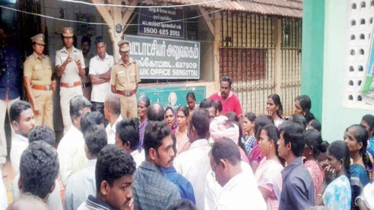 காவல் சோதனை சாவடி கட்டிடம் கட்டக் கூடாது என்றும் மீறி கட்டிடம் கட்டினால் குடும்ப அட்டைகளை ஒப்படைப்போம் என்றும் செங்கோட்டையில் தாலுகா அலுவலகத்தை முற்றுகையிட்டு மக்கள் போராட்டத்தில் ஈடுபட்டனர்.