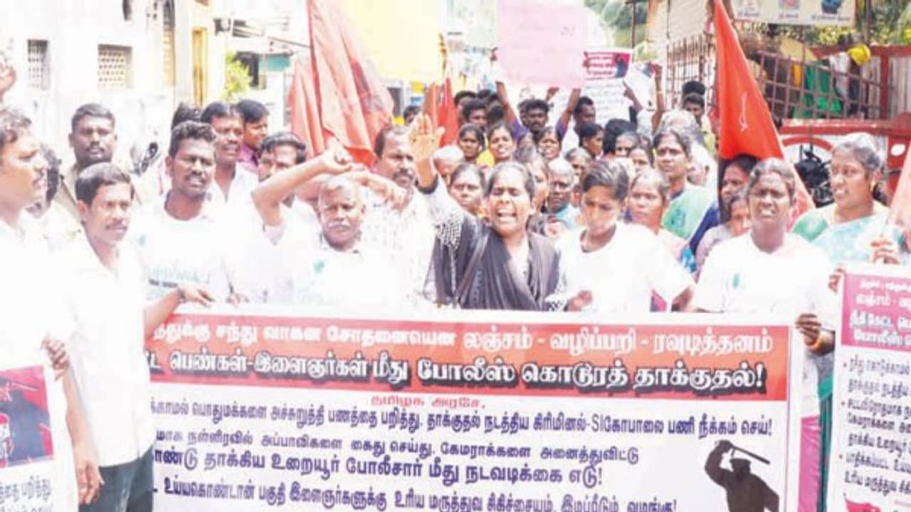 அராஜகத்தில் ஈடுபட்ட காவலாளர்களைக் கண்டித்து திருச்சியில் மக்கள் போராட்டத்தில் ஈடுபட்டனர். பத்து பேர் மீது போடப்பட்டுள்ள பொய் வழக்கை திரும்ப பெறக்கோரினர்.