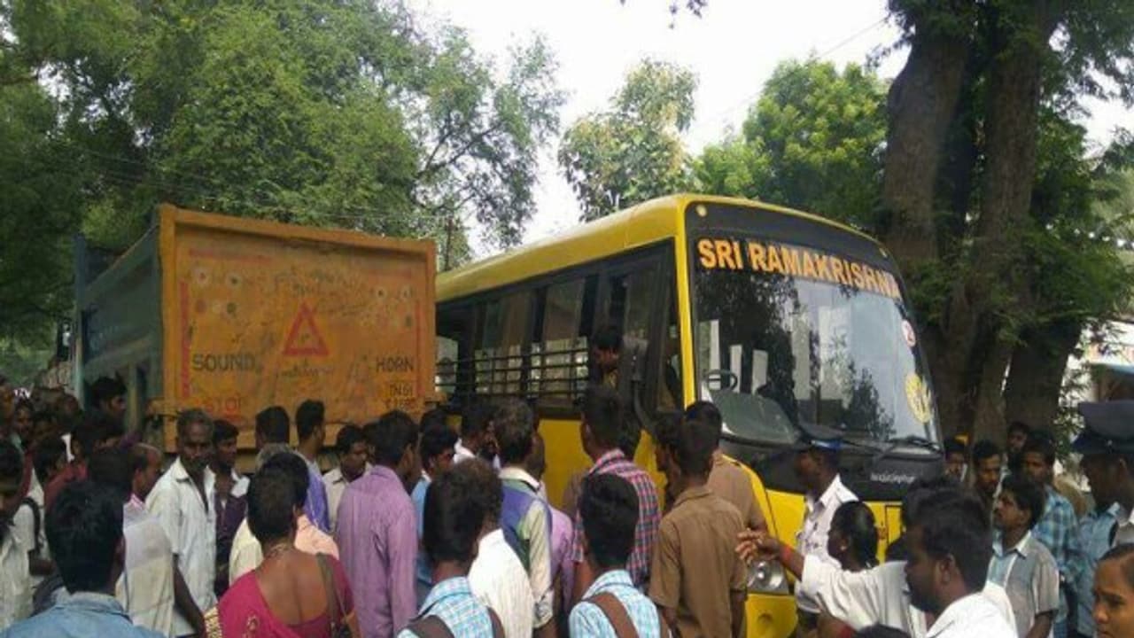 அரியலூர் அருகே பள்ளி பேருந்து மீது லாரி மோதிய விபத்தில் 5 மாணவர்கள் காயம் அடைந்தனர். இதனால் போக்குவரத்து பாதிப்புக்கு கண்டனம் தெரிவித்து அப்பகுதி மக்கள் சாலை மறியல் போராட்டத்தில் ஈடுபட்டனர்.