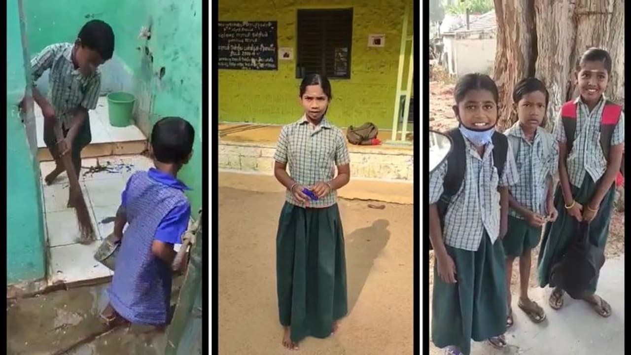 தற்போது இதுதொடர்பான வீடியோ ஓன்று வெளியாகி சமூக வலைத்தளங்களில் வைரலாகி வருகிறது. அதில், 'இரண்டு குழந்தைகள் பள்ளி பாத்ரூமை துடைப்பம் கொண்டு கழுவி வருகின்றனர். அப்போது ஒரு நபர், நீ ஏன் பாத்ரூம் கழுவிட்டு வர என்று கேட்க, அந்த விபரம் அறியாத சிறுவன் யார் முதலில் பள்ளிக்கு வருகிறார்களோ அவர்கள் தான், பாத்ரூமை கழுவ வேண்டும் என்று சொன்னாங்க என்று மழலை மாறாமல் சொல்கிறான் அந்த சிறுவன்.