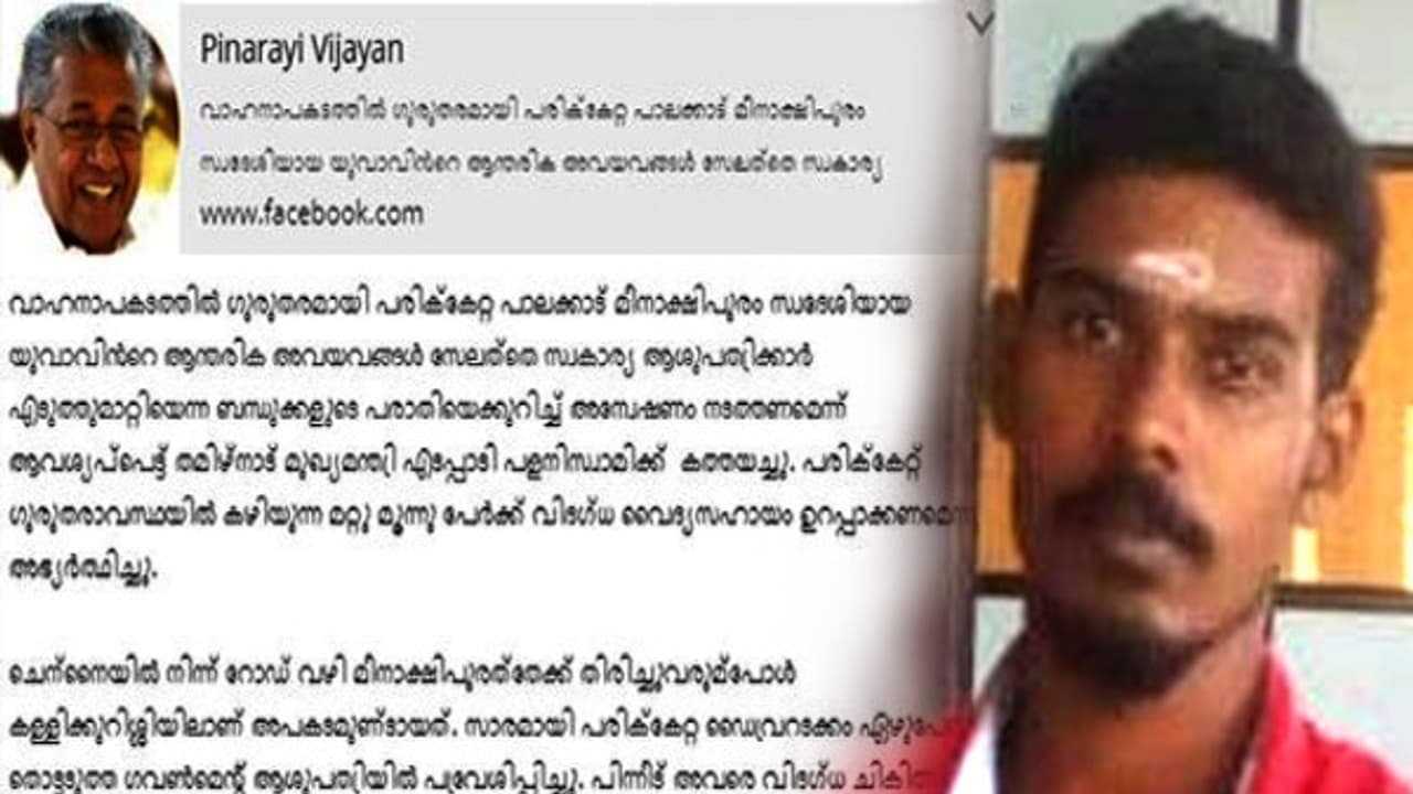 இது குறித்து, கேரள முதலமைச்சர் பினராயி விஜயன், தனது பேஸ்புக் பக்கத்தில், உடலுறுப்புகளை பறித்த மருத்துவமனை மீது நடவடிக்கை எடுக்க வேண்டும். மேலும் இந்த மிருகத்தனமான செயலை செய்த அந்த மருத்துவமனைக்கு உரிய தண்டனை பெற்றுத் தர வேண்டும் என்று தமிழக முதலமைச்சர் எடப்பாடி பழனிசாமியிடம் கேட்டுக் கொண்டுள்ளார். இது தொடர்பாக முதலமைச்சர் எடப்பாடி பழனிசாமிக்கு, பினராயி விஜயன் கடிதம் ஒன்றையும் அனுப்பியுள்ளார்.