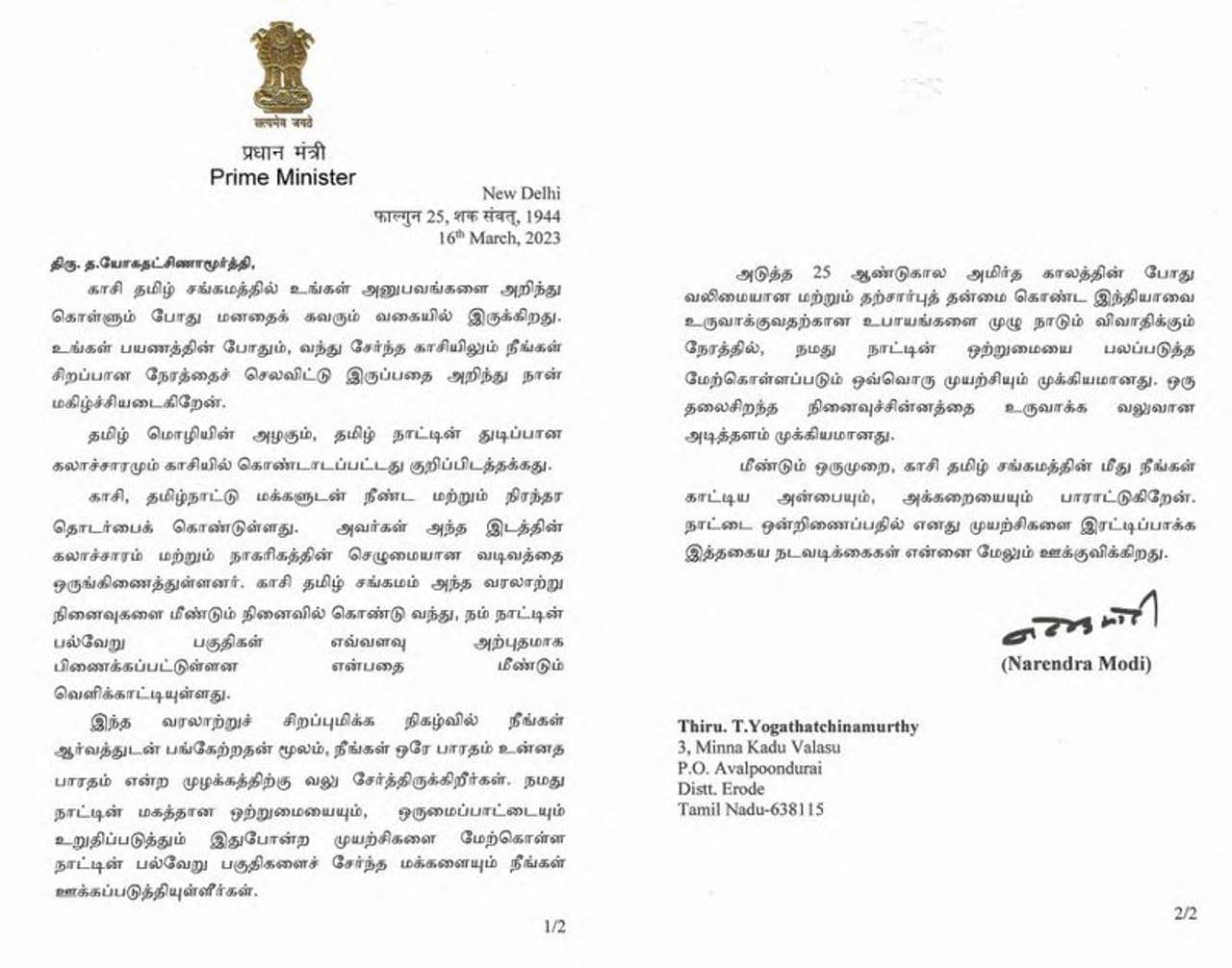 2022ஆம் ஆண்டு வாரணாசியில் நடைபெற்ற காசி தமிழ் சங்கமத்தில் கலந்துகொண்ட அனுபவங்கள் குறித்து தமிழகத்தைச் சேர்ந்த நூற்றுக்கணக்கானவர்கள் பிரதமருக்கு கடிதங்கள் எழுதியுள்ளனர். அவர்களுக்கு பிரதமர் மோடி தனிப்பட்ட முறையில் பதில் கடிதங்கள் எழுதியுள்ளார்.