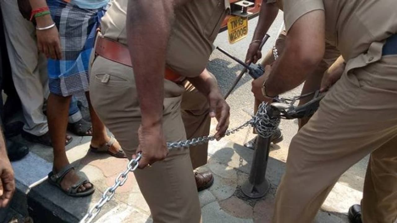 இதனால் அங்கு வாகன நெரிசல் ஏற்பட்டுள்ளது. தற்போது சங்கிலியை அகற்றியதால், வாகனங்கள் மெல்ல மெல்ல நகர தொடங்கியுள்ளது.