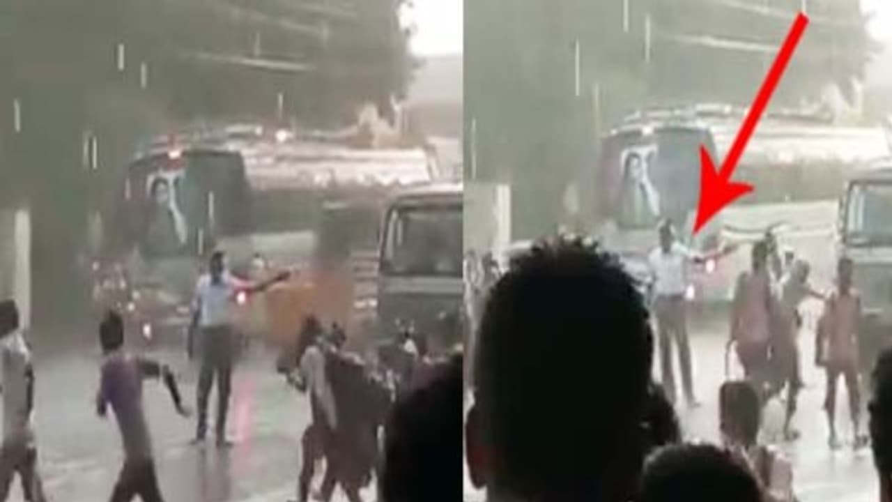 கனமழை பெய்துகொண்டிருந்த போதும் முக்கிய சாலை என்பதால் பேருந்துகளும், லாரிகளும் சாலையில் போய்க்கொண்டிருந்தன. அதே நேரத்தில் மாணவர்களும் ரோடை கிராஸ் பண்ணியதால் அதிர்ச்சி அடைந்த அந்த போக்குவரத்து காவலர் கொட்டும் மழையை பொருட்படுத்தாது சாலையில் இறங்கி போக்குவரத்தை சீர் செய்யத் தொடங்கினார்.