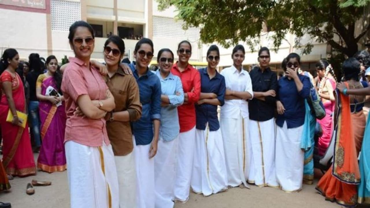 சென்னை ஜெயின் கல்லூரி பொங்கல் கொண்டாட்டத்தில் மாணவிகள் வேட்டி கட்டி வந்து அசத்தினர்.
