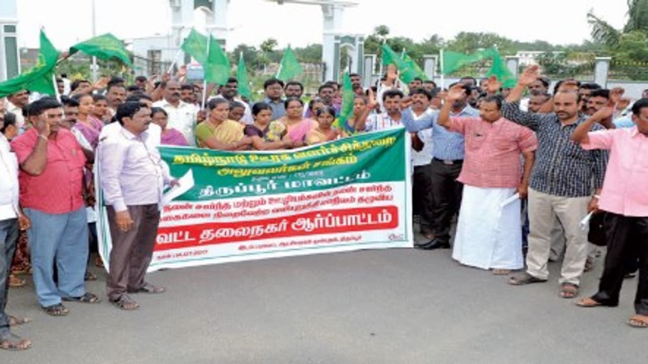 இந்த ஆர்ப்பாட்டத்திற்கு மாவட்டத் தலைவர் ஞானசேகரன் தலைமை வகித்தார். மாவட்டத் துணைத் தலைவர் ராஜகோபால் வரவேற்றுப் பேசினார். மாவட்டச் செயலாளர் செந்தில்குமார், மாநிலத் துணைத் தலைவர் ரமேஷ், அரசு ஊழியர்கள் சங்க மாவட்டச் செயலாளர் அம்சராஜ் ஆகியோர் முன்னிலை வகித்தனர்.