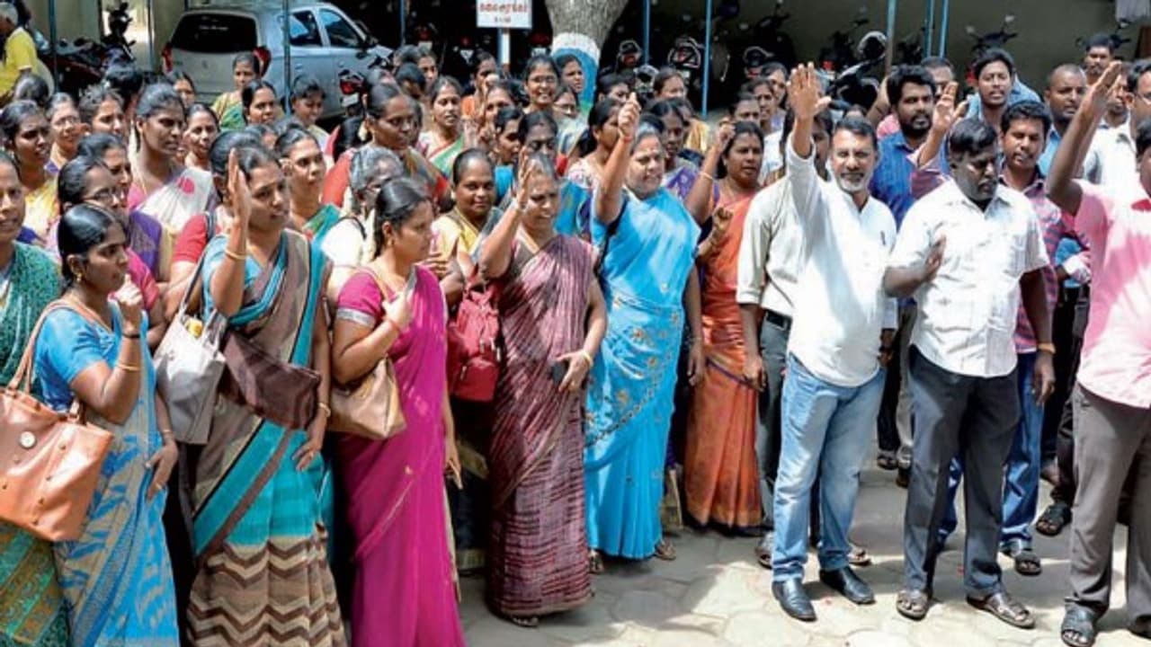 இந்த நிலையில், நேற்று கலந்தாய்வில் பங்கேற்க வந்த தொடக்கப்பள்ளி ஆசிரியர்கள் பள்ளியில் ஒட்டப்பட்டிருந்த ஆணையை பார்த்து, "வேறு மாவட்டங்களுக்கு மாறுதல் பெற்று செல்ல முடியாததாலும், முன்னதாகவே இந்த தகவல் தெரிவிக்கப்படவில்லை" என்று கூறியும் பிஷப் உபகாரசாமி மேல்நிலைப்பள்ளியின் முன்பு ஆசிரியர்கள் ஆர்ப்பாட்டத்தில் ஈடுபட்டனர்.