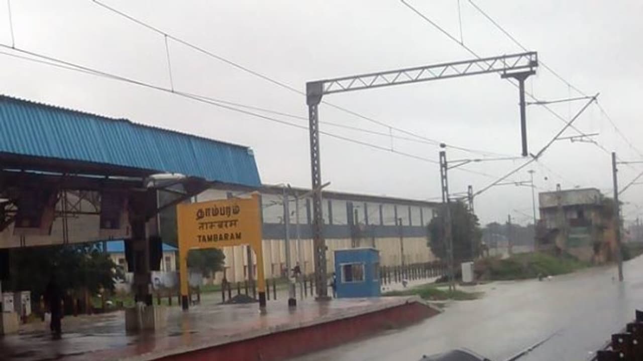 இது போல், தாழ்வான பகுதியான சென்னை தாம்பரத்திலும் சாலையில் வெள்ள நீர் பெருக்கெடுத்தது. பிரதான ஜி.எஸ்.டி., சாலையை அடுத்துள்ள தாம்பரம் ரயில் நிலையத்தில், மழை நீர் பெருமளவில் சேர்ந்தது. வெளியேற வழியின்றி, ரயில்வே தண்டவாளங்களில் நீர் சேர்ந்தது. இதனால் தண்டவாளங்கள் நீரில் மூழ்கின. மழை இடைவிடாமல் 4 மணி நேரத்துக்கும் மேல் கொட்டித் தீர்த்ததால் ரயில் பாதைகளில் மழை நீர் மேலும் மேலும் அதிகரித்துக் கொண்டே வந்தது.