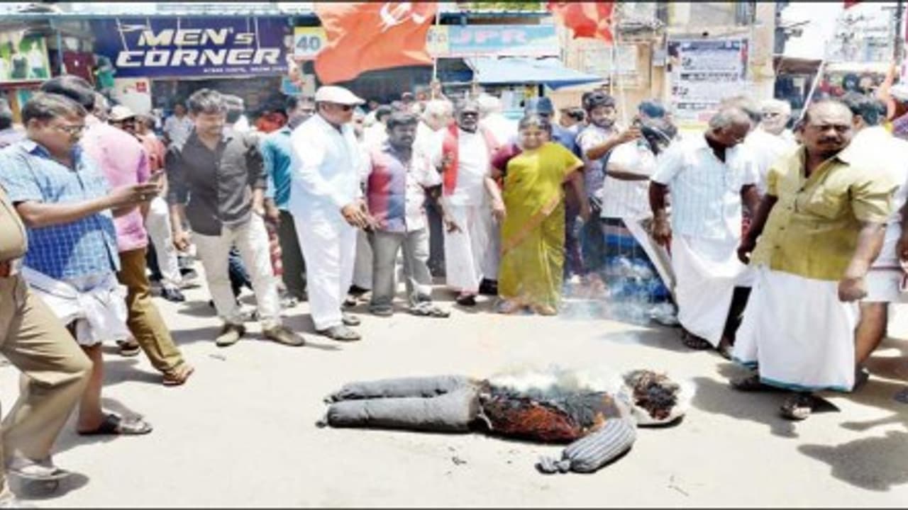 சீதாராம் யெச்சூரியை தாக்கியதைக் கண்டித்து, திண்டுக்கல்லில் மார்க்சிஸ்ட் கம்யூனிஸ்டு கட்சியினர் நடத்திய ஆர்ப்பாட்டத்தில் ஆர்.எஸ்.எஸ். இயக்கத் தலைவர் மோகன் பகவத்தின் உருவபொம்மை எரிக்கப்பட்டது.