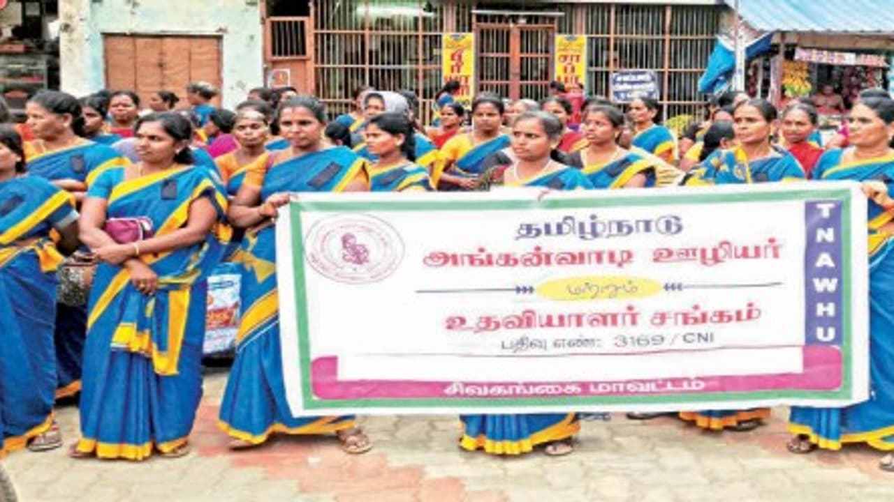 அனைத்து அங்கன்வாடி பணியாளர்களுக்கும் காலமுறை ஊதியம் வழங்கிட வேண்டும் உள்ளிட்ட பல்வேறு கோரிக்கைகளை வலியுறுத்தி சிவகங்கையில் அங்கன்வாடி ஊழியர் மற்றும் உதவியாளர் சங்கத்தினர் கண்டன ஆர்ப்பாட்டத்தில் ஈடுபட்டனர்.