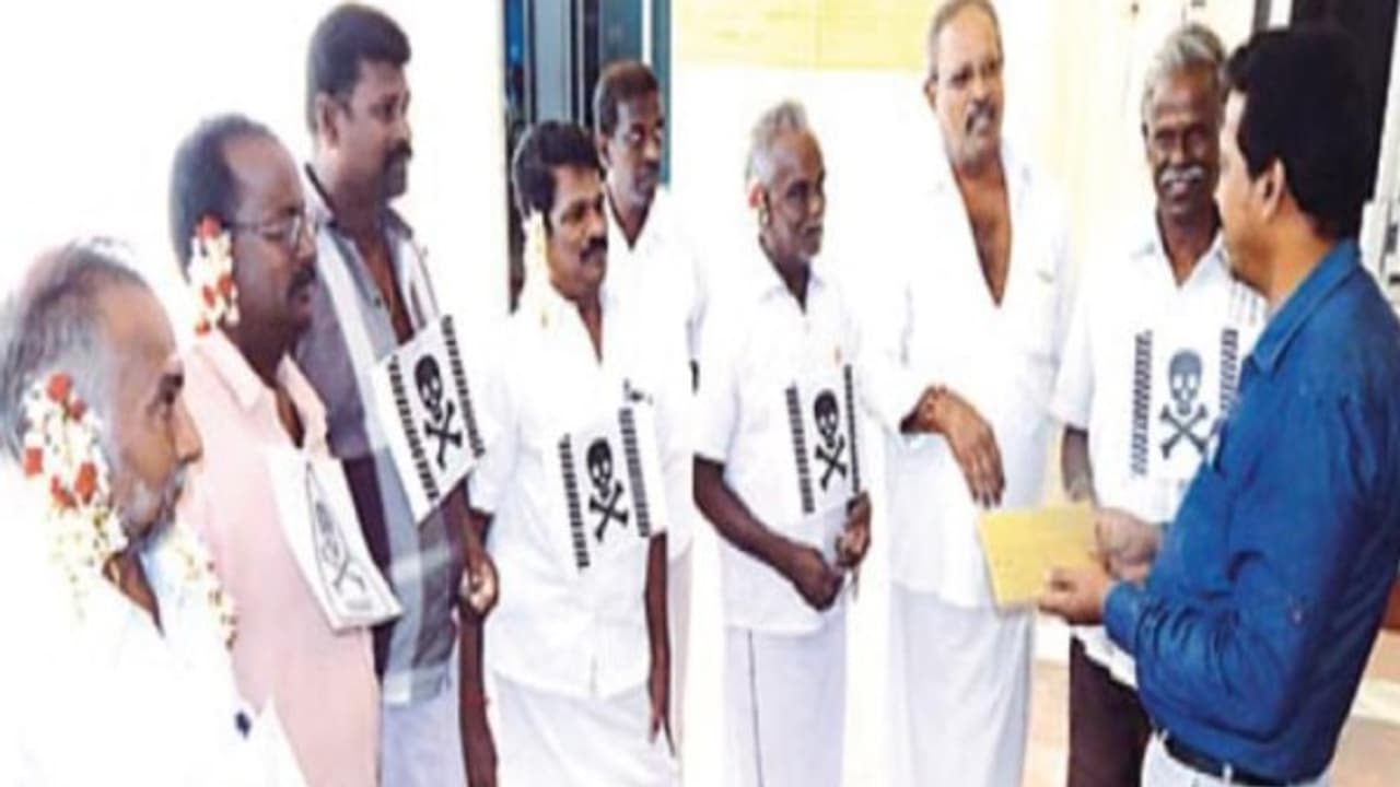 அவர்கள் காதில் பூ வைத்துக் கொண்டும், அபாய மண்டை ஓடு குறியீட்டை சட்டையில் ஒட்டியும் நூதன போராட்டம் நடத்தினர்.