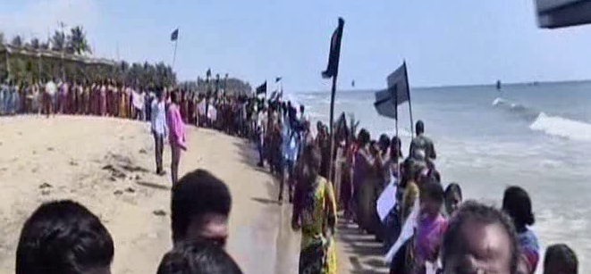 இலங்கை கடற்படைக்கு கண்டனம் தெரிவிக்கும் விதமாக புதுச்சேரி மீனவர்கள், கடலில் இறங்கி மனித சங்கிலி போராட்டம் நடத்தி வருகின்றனர்.