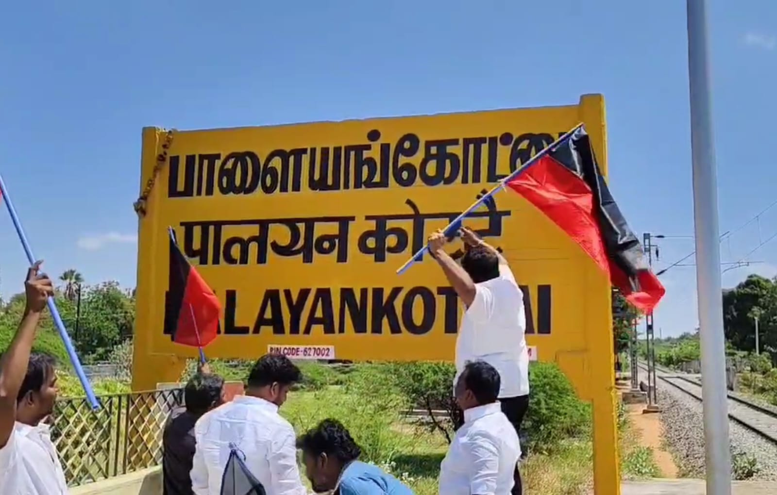 இந்த பரபரப்பான சூழ்நிலையில் தமிழகத்தில் பல்வேறு இடங்களில் திமுக மற்றும் அதன் கூட்டணி கட்சிகள் சார்பாக போராட்டங்கள் நடைபெற்று வருகிறது. அந்த வகையில் ரயில் நிலையங்களில் இந்தியை அழித்து தங்களது எதிர்ப்புகளை தெரிவித்து வருகிறார்கள். நெல்லை பாளையங்கோட்டை ரயில் நிலையத்தில் உள்ள பெயர் பலகையில் இருக்கும் இந்தி பெயரை திமுக பொறியாளர் அணி மாநில துணை செயலாளர் ராஜ வர்மன் தலைமையிலான திமுகவினர் கருப்பு மை பூசி அழித்தனர. மேலும் பெயர் பலகையில் தமிழ் வாழ்க என்ற வாசகத்தை எழுதி தமிழ் வாழ்க என்ற கோசத்துடன் அங்கிருந்து வெளியேறினர்.