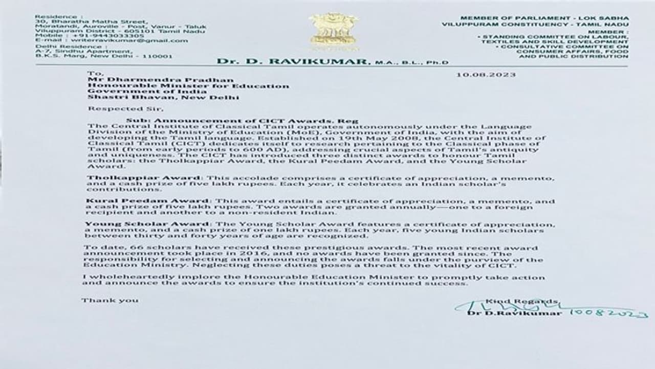 செம்மொழித் தமிழாய்வு மத்திய நிறுவனத்தின் தொல்காப்பியர் விருது, குறள் பீடம்விருது, இளம் அறிஞர் விருது ஆகியவற்றை உடனடியாக அறிவிக்க வேண்டும் என வலியுறுத்தி ஒன்றிய கல்வி அமைச்சர் தர்மேந்திர பிரதானுக்கு விழுப்புரம் எம்.பி. ரவிக்குமார் கடிதம் எழுதியுள்ளார்.
