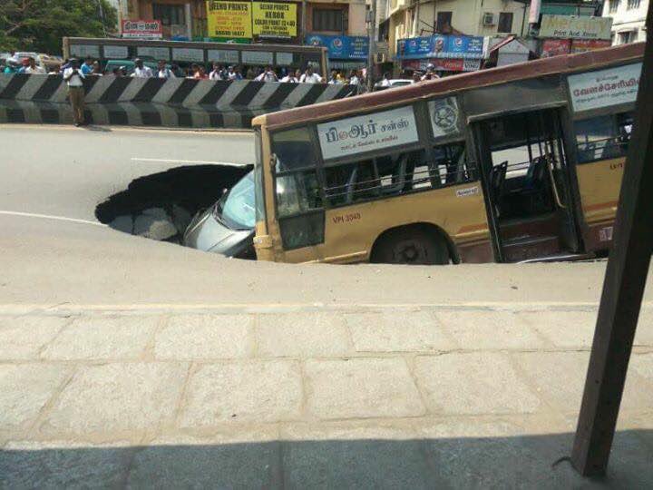 தற்போது இந்த இடத்திற்கு அருகே மீண்டும் புதிய பள்ளம் உருவாகி, அந்த பள்ளத்தில் பேருந்தும் , காரும் கவிழ்ந்திருப்பது பெரும் பரபரப்பை ஏற்படுத்தி உள்ளது.