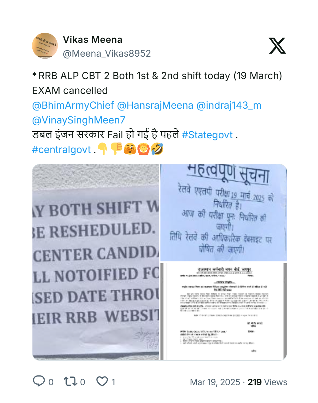 ரயில்வே துறையில், லோகோ பைலட் மற்றும் குரூப்-டி நிலைககான 32,438 காலிப் பணியிடங்களை நிரப்ப தேர்வு இன்று (19.03.2025) தேர்வு நடைபெறும் என அறிவிக்கப்பட்டிருந்தது. ஆனால், இந்தத் தேர்வு கடைசிக் கட்டத்தில் ரத்து செய்யப்பட்டிருக்கிறது.