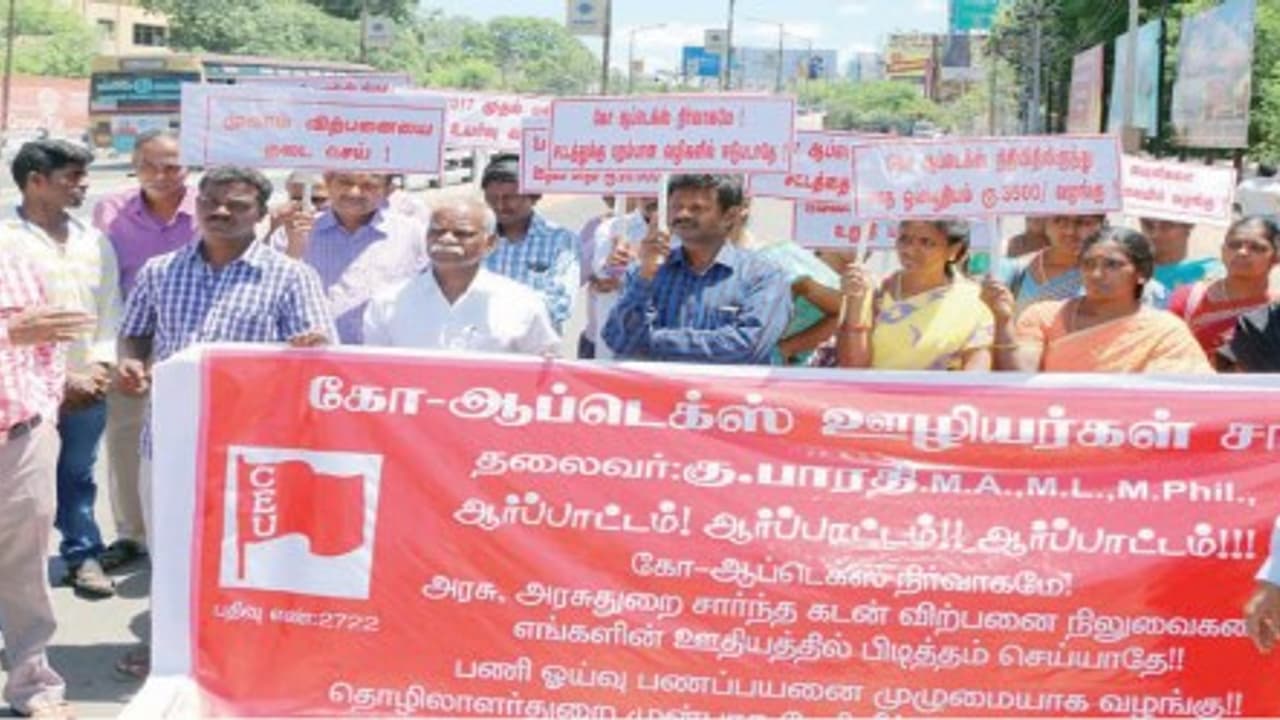 இந்த ஆர்ப்பாட்டத்தில் தொழிற்சங்க மைய குழு மாநில துணைத் தலைவர் சந்திரமோகன் உள்பட சேலம், நாமக்கல், கரூர், தர்மபுரி, கிருஷ்ணகிரி மாவட்டங்களில் பணிபுரியும் கோ–ஆப்டெக்ஸ் ஊழியர்கள் பலர் திரளாக இதில் பங்கேற்றனர்.