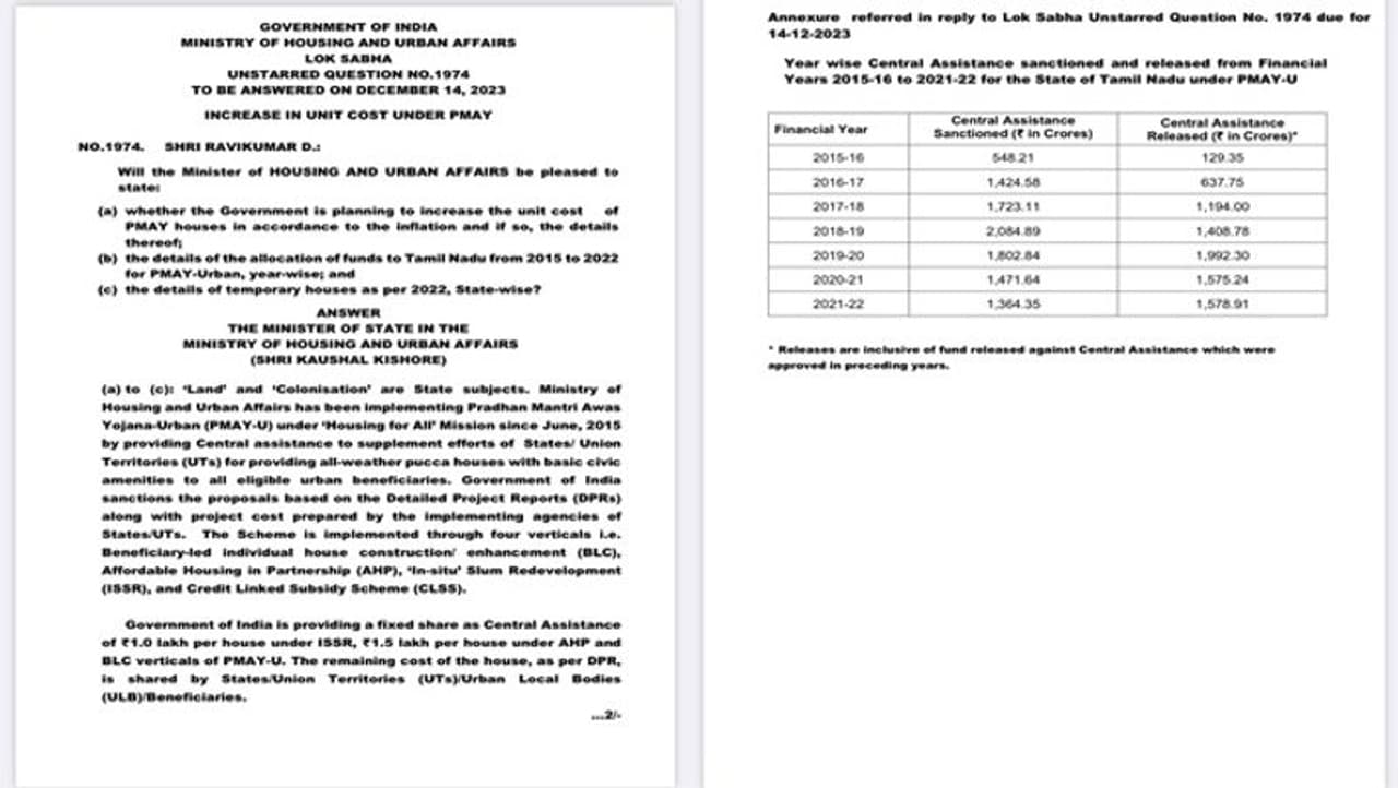 நாடாளுமன்ற மக்களவையில், “பண வீக்கத்துக்கு ஏற்ப பிரதமர் நகர்ப்புற வீடுகட்டும் திட்டத்தில் ஒரு வீட்டுக்கு நிர்ணயிக்கப்படும் தொகையை உயர்த்தி வழங்கும் திட்டம் உள்ளதா?; 2015-16 முதல் 2021-22 வரை இந்தத் திட்டத்தின்கீழ் தமிழ்நாட்டுக்கு ஒதுக்கப்பட்ட நிதி எவ்வளவு?” ஆகிய கேள்விகளை விழுப்புரம் எம்.பி ரவிக்குமார் எழுப்பியிருந்தார்.