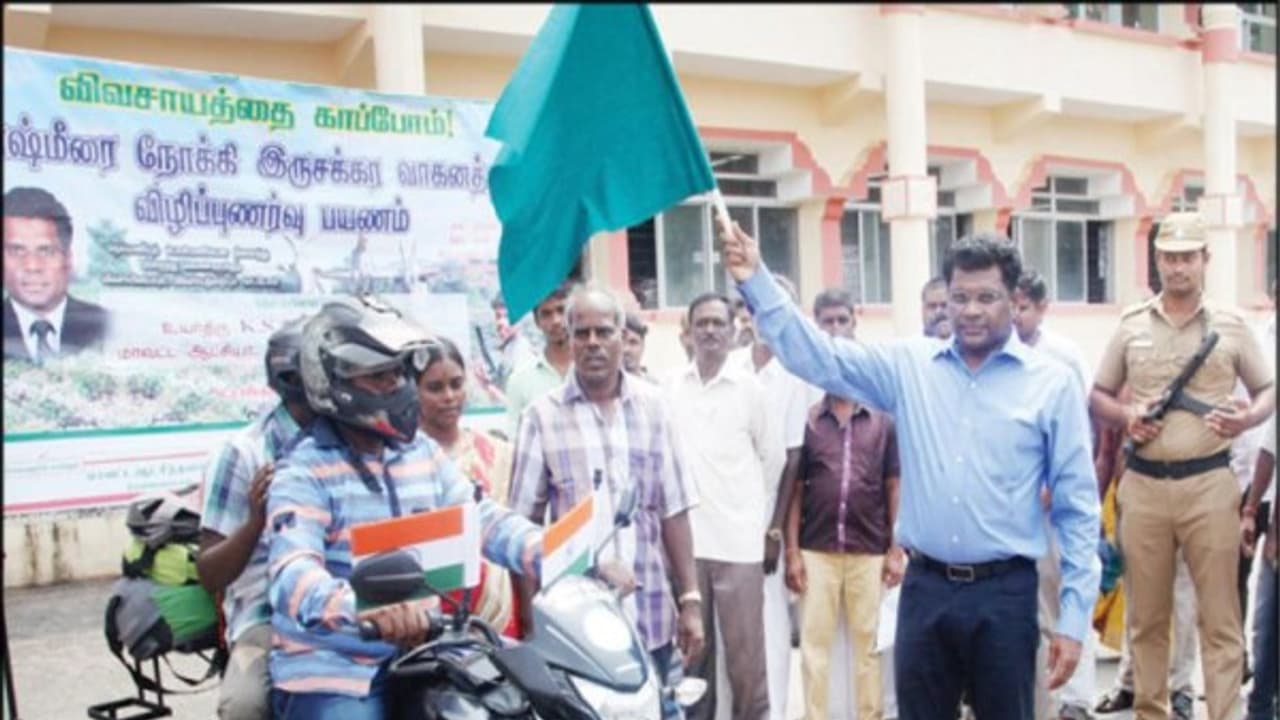 இதுகுறித்து ஆட்சியர் கந்தசாமி கூறுகையில், ‘படவேடு பகுதியை சேர்ந்த இவர்கள் திருவண்ணாமலையில் இருந்து காஷ்மீர் வரை விவசாயத்தை காப்பாற்றுவதற்காக மோட்டார் சைக்கிளில் விழிப்புணர்வு ஏற்படுத்துவதற்காக 30 நாட்கள் பயணம் மேற்கொள்கிறார்கள்.
